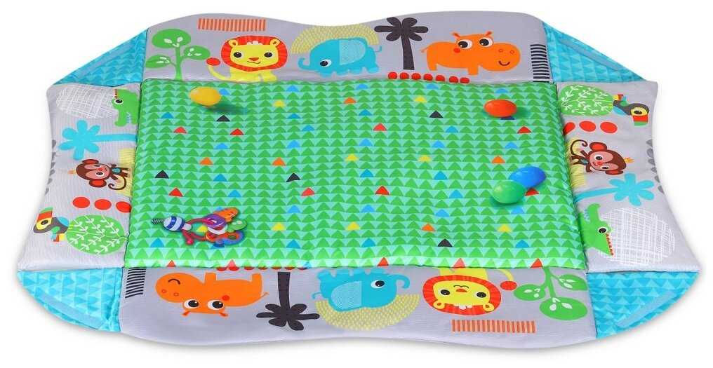 - + Яркий, с бортиками, достаточное количество игрушек в комплекте