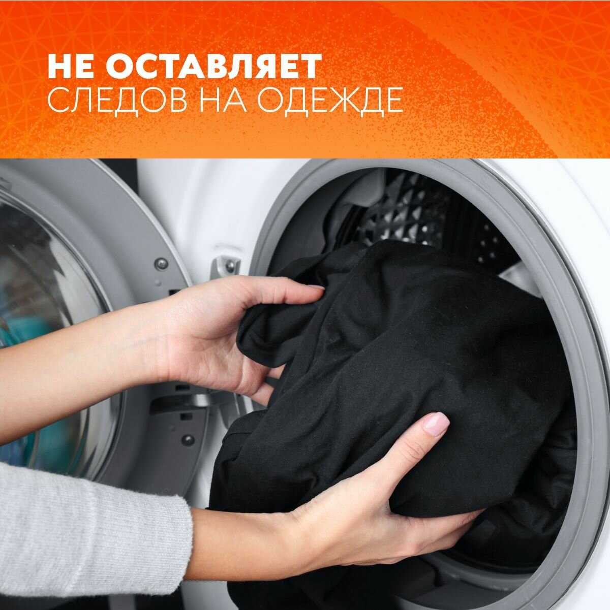 При правильной дозировке гель полностью выполаскивается, не оставляя белёсых следов на чёрной и цветной одежде. Это подтверждается отзывами пользователей, регулярно стирающих тёмное бельё без применения дополнительных ополаскивателей. Однако превышение рекомендуемого объема может привести к появлению разводов из-за высокой концентрации. -