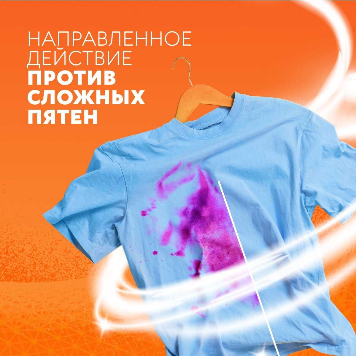 - Справляется с застарелыми пятнами, включая мазут и пожелтевшие участки на белом белье, без предварительного замачивания.