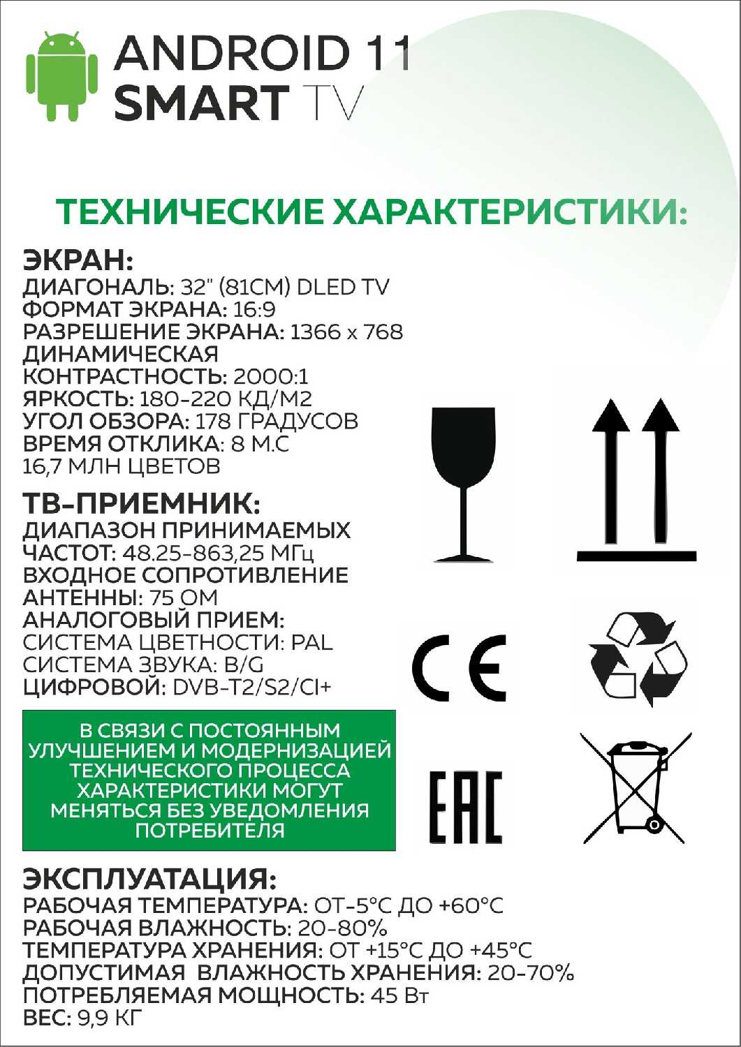 Характеристи Smart TV Телевизор (Android 11.0/HD/32")