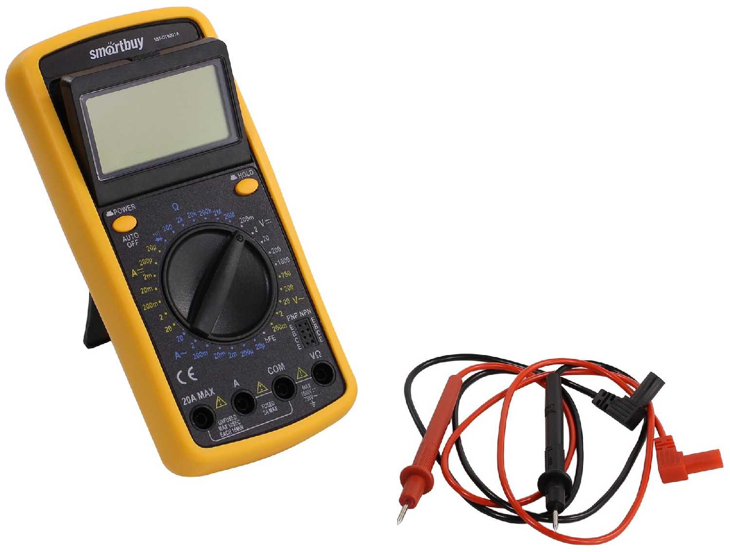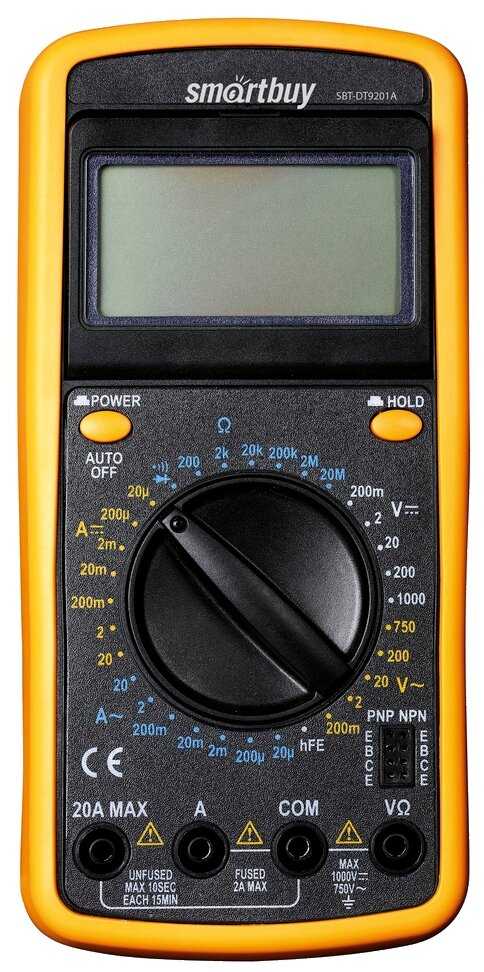 - Измеряет постоянный и переменный ток до 20 А, напряжение, сопротивление, диоды и коэффициент усиления транзисторов (hFE) с погрешностью 0,5–1,8%.