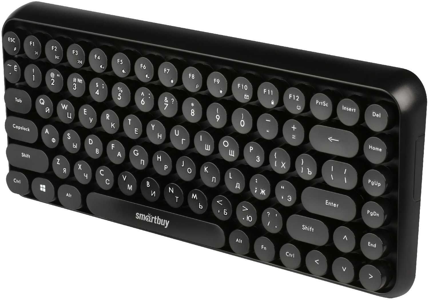 Необычный вид клавиш, требуется привыкание. Большой ход клавиш. Русские и английские буквы одного цвета.