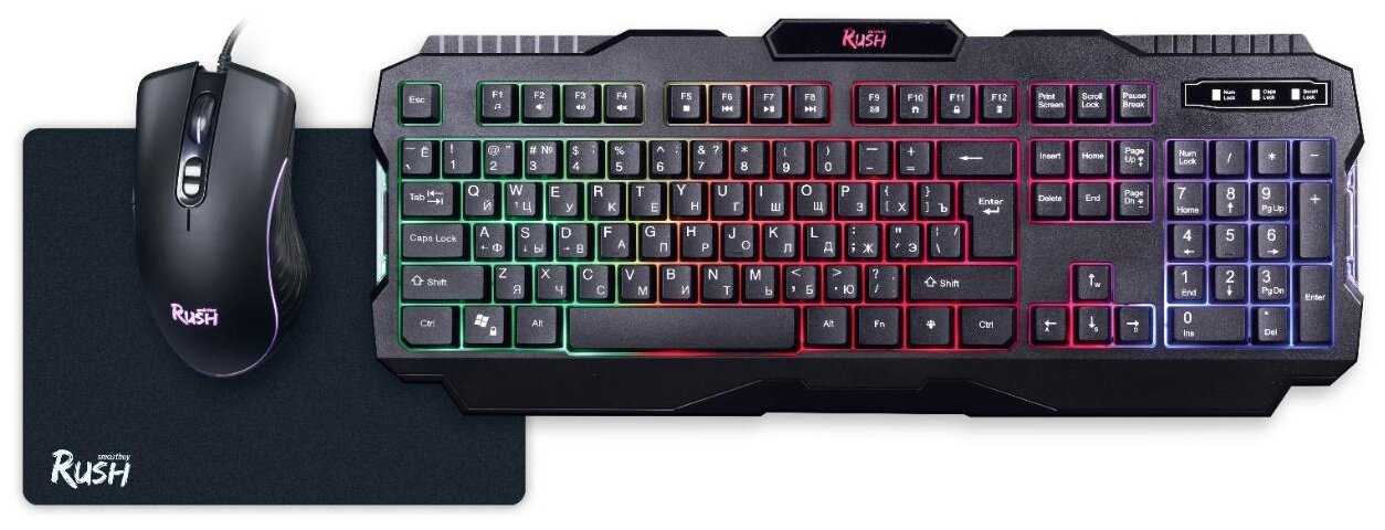 - + Все как написано,подсветка огонь ) Клавиши приятно нажимать,не брякают,мышь тоже все чётко,и коврик бонусом