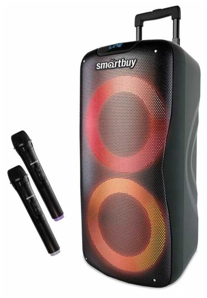 - + Хорошая акустическая система. Есть блютуз, радио, usb, Micro, два входа для микрофонов (jack 6,3), aux, регулирование громкости, эквалайзер, басы и др. В комплекте два беспроводных микрофона, пульт ДУ. Есть зарядка для колонки. Звук хороший, радио ловит без проблем, автоматически ищет рабочие волны. Микрофоны подключаются тоже автоматически.
