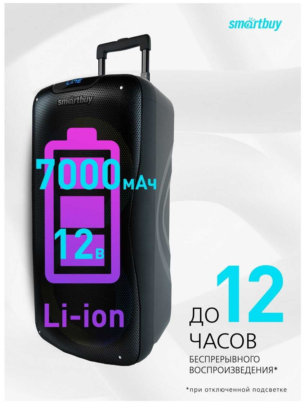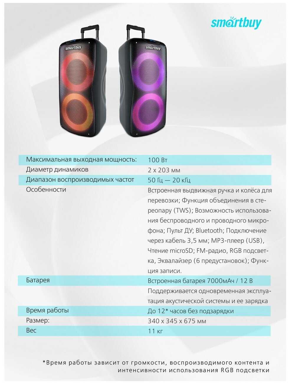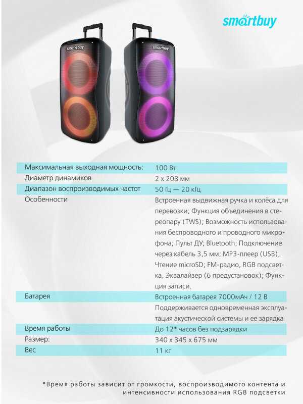 - + Громкий чистый звук,ручка и колёсики для транспортировки,два микрофона для караоке,долгая работа от аккумулятора,приятная сменяющая цвет подсветка