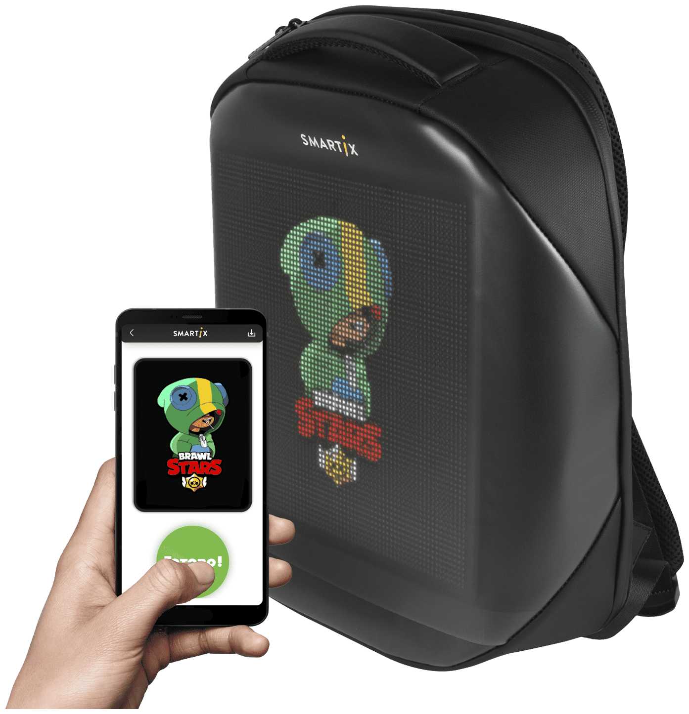 - + Качество сборки, удобно сидит на спине, лямки толстые и мягкие. Прикольно светится, можно поставить фото, gif, текст или всё сразу( будет меняться само). Например школьнику: Иванов И. 4А.