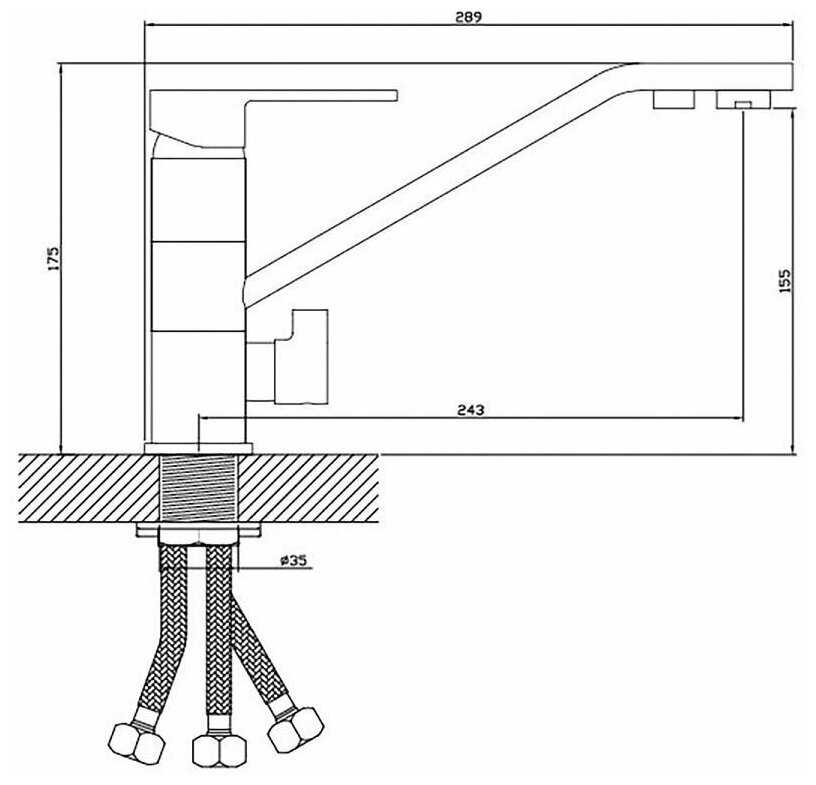 Oute цвет матовый хром, однорычажное управление. Фиксированный излив. Монтаж на одно отверстие, на гайке. Гибкая подводка. Присоединительный размер 1/2". С аэратором. Высота смесителя 200 mm. Материал нержавеющая сталь SUS 304.