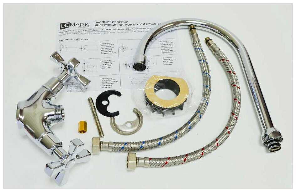 - керамическим картриджем и металлической рукояткой; С-образная резиновая шайба; С-образная металлическая шайба; металлический штифт с резьбой; гайка; гибкая подводка для воды (гайка - сталь