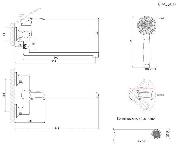 - длина излива: 150 мм.