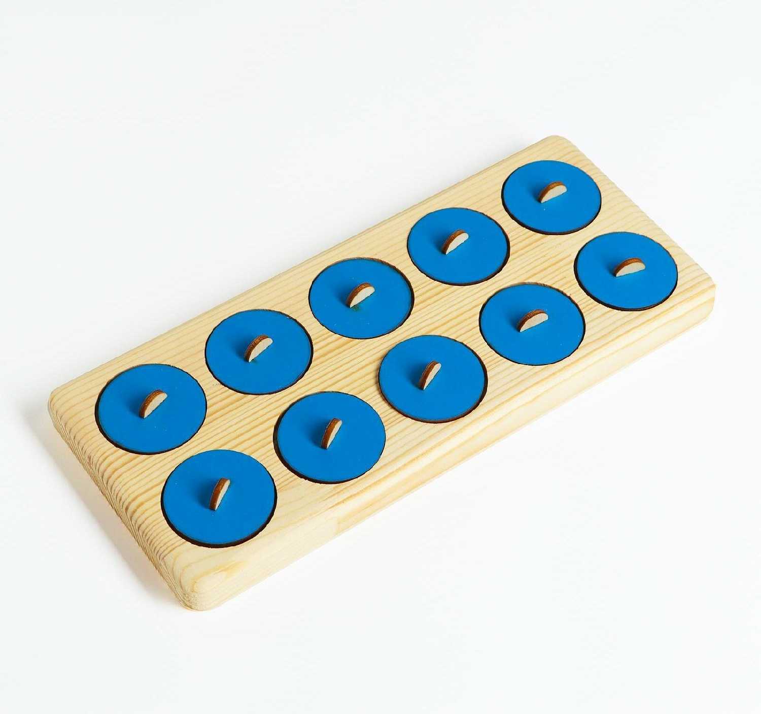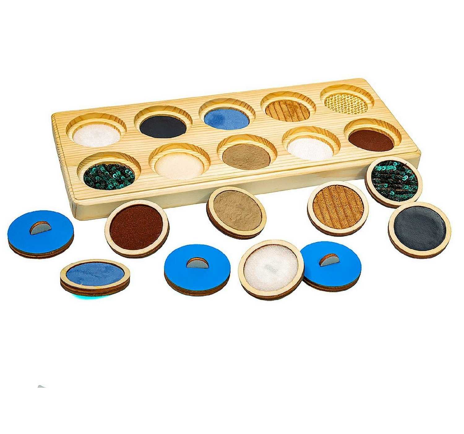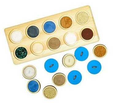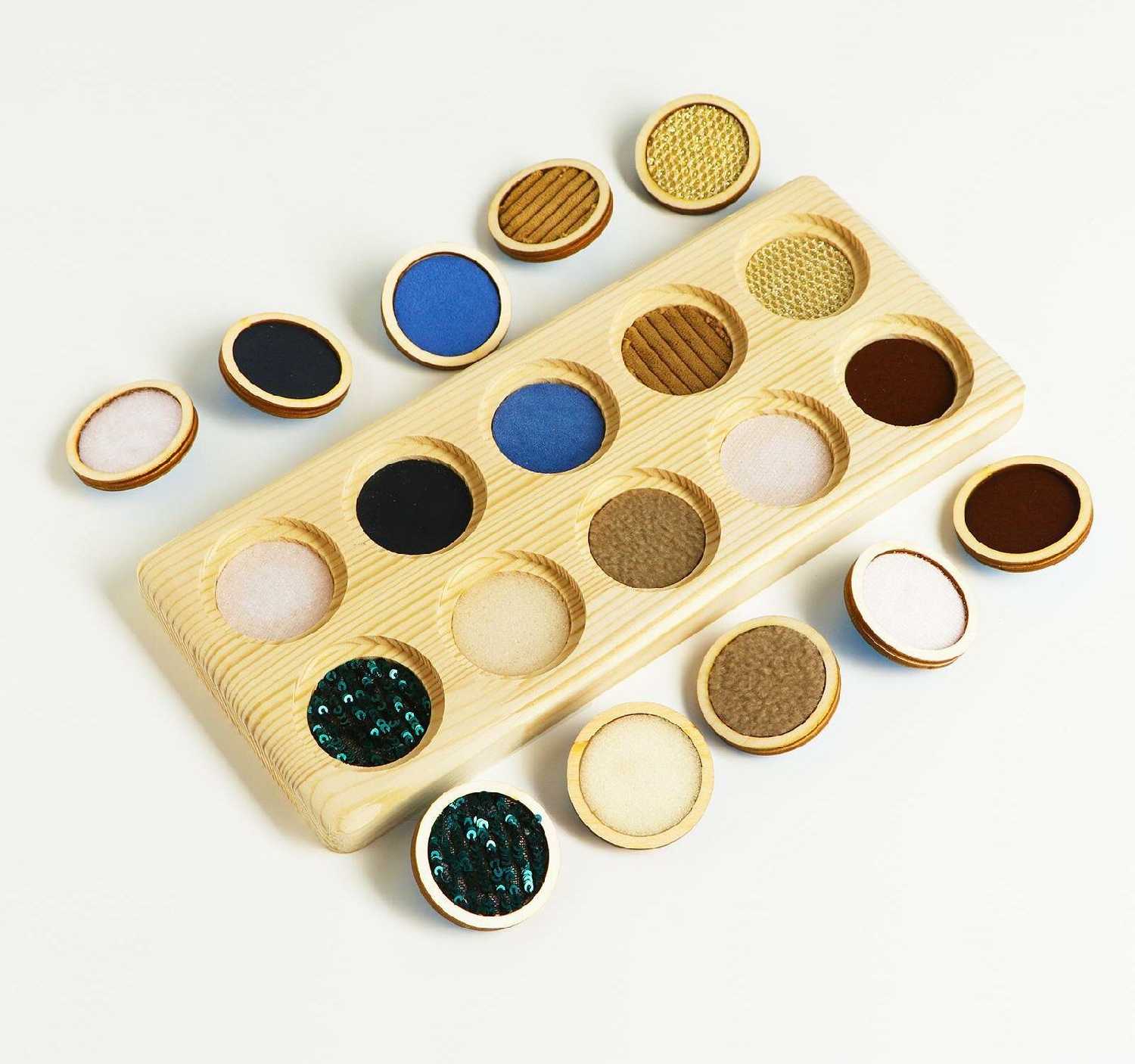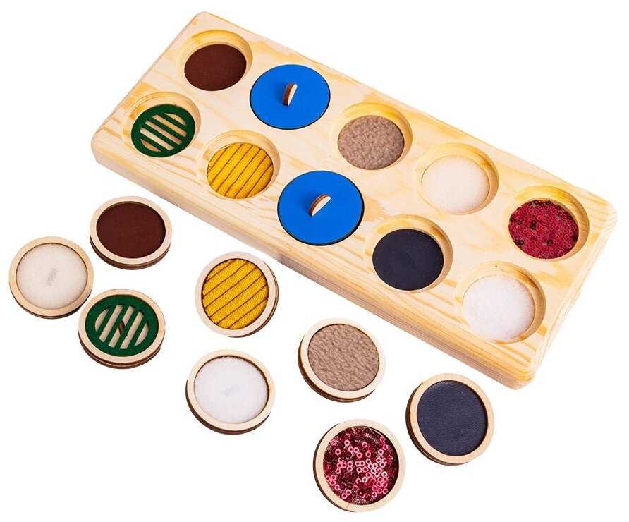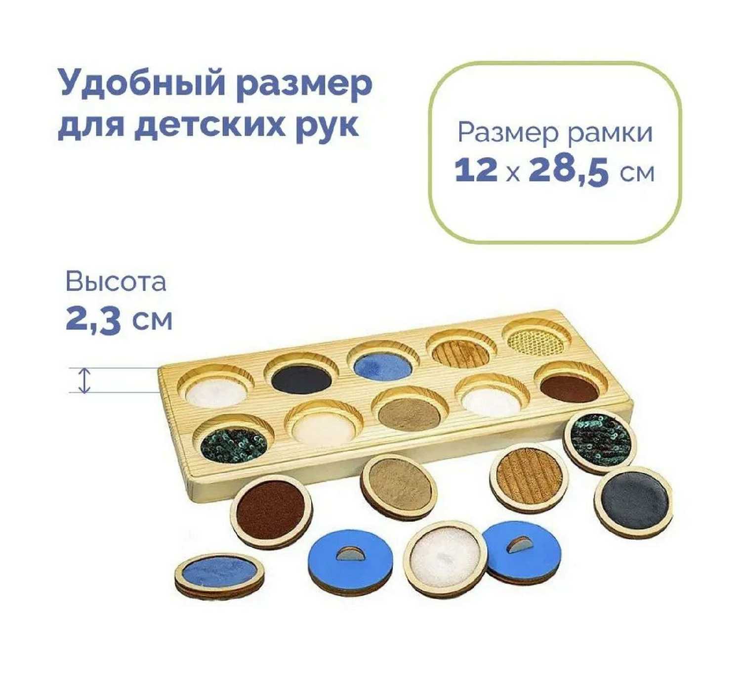 Комплектация : | планшет прямоугольной формы из массива сосны размером 28, 5 х 12 х 2, 3 см с 10 фактурами, 10 фишек фактур с ручками для тренировки пинцетного захвата |