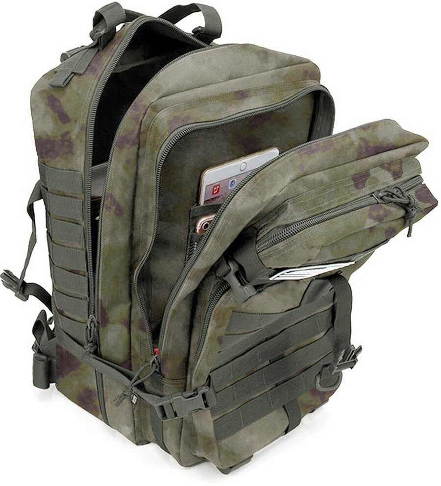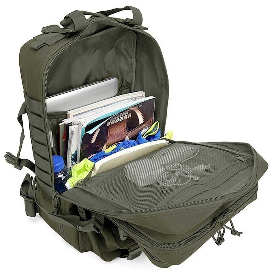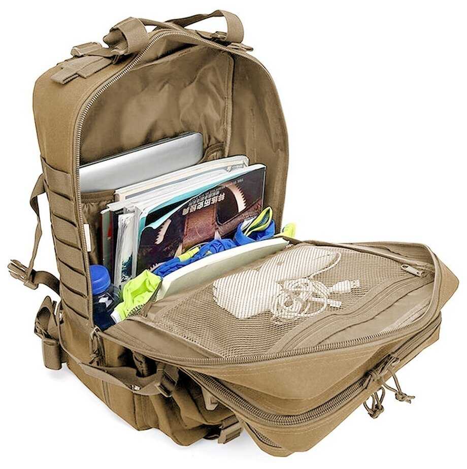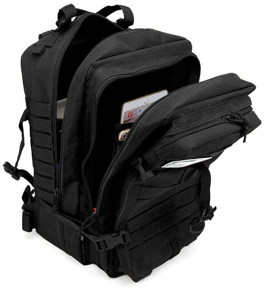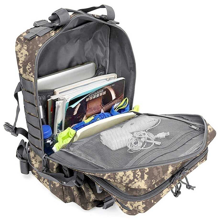 Продуманная система включает несколько больших и средних карманов, включая скрытые отделения для проводов или мелких предметов. Петли Molle на внешней стороне позволяют крепить дополнительное снаряжение карабинами. Критичным недостатком пользователи назвали отсутствие боковых карманов для бутылки воды. -