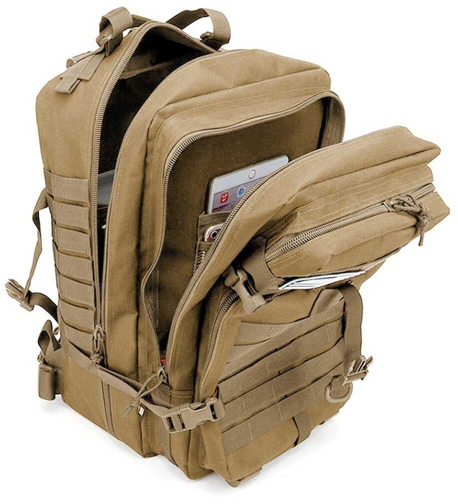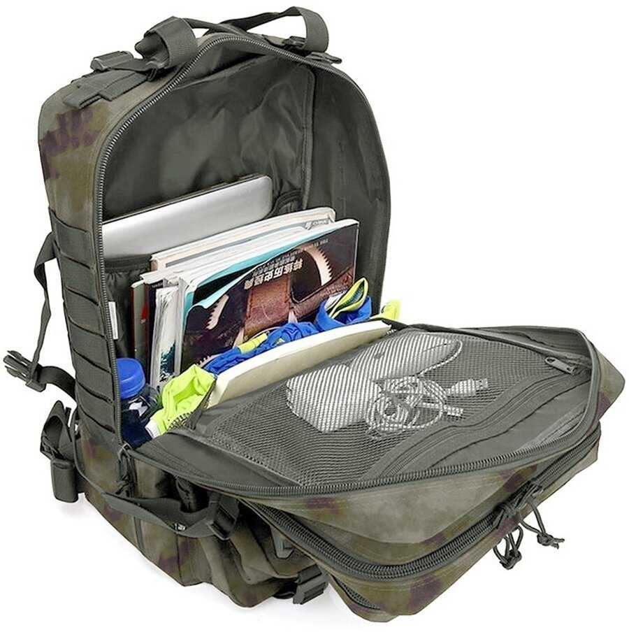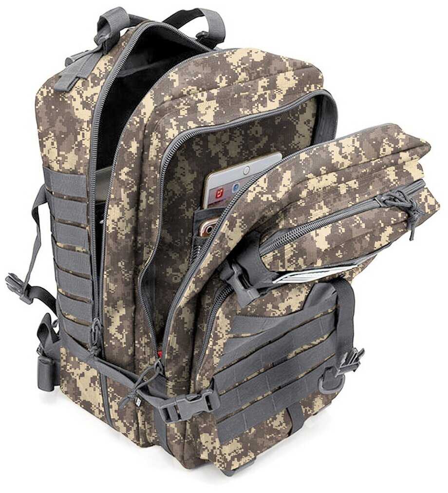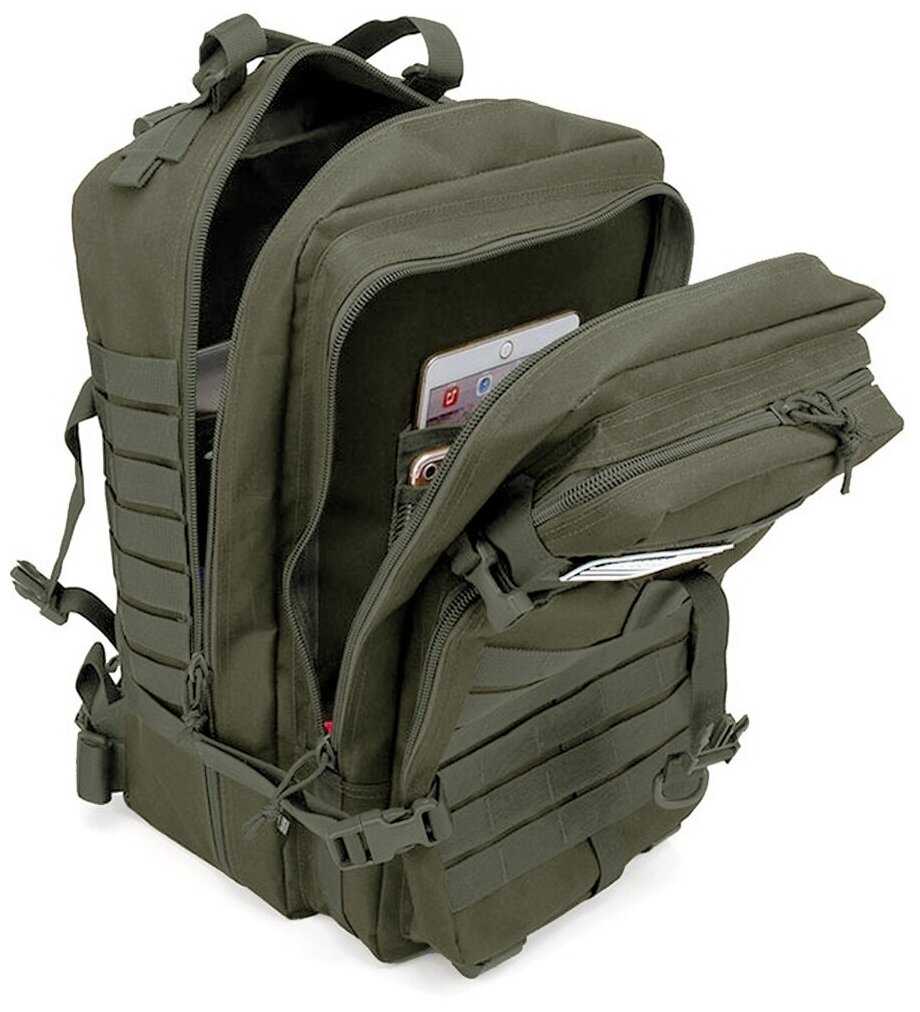 Продуманная система включает несколько больших и средних карманов, включая скрытые отделения для проводов или мелких предметов. Петли Molle на внешней стороне позволяют крепить дополнительное снаряжение карабинами. Критичным недостатком пользователи назвали отсутствие боковых карманов для бутылки воды. -