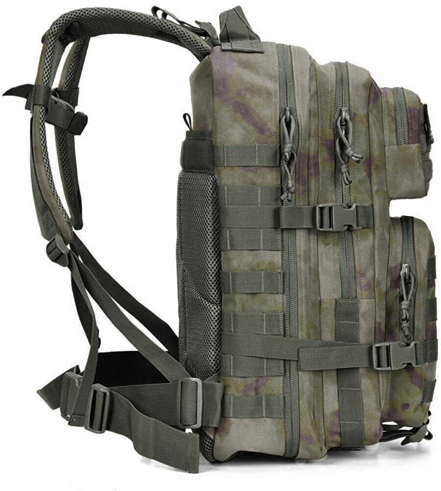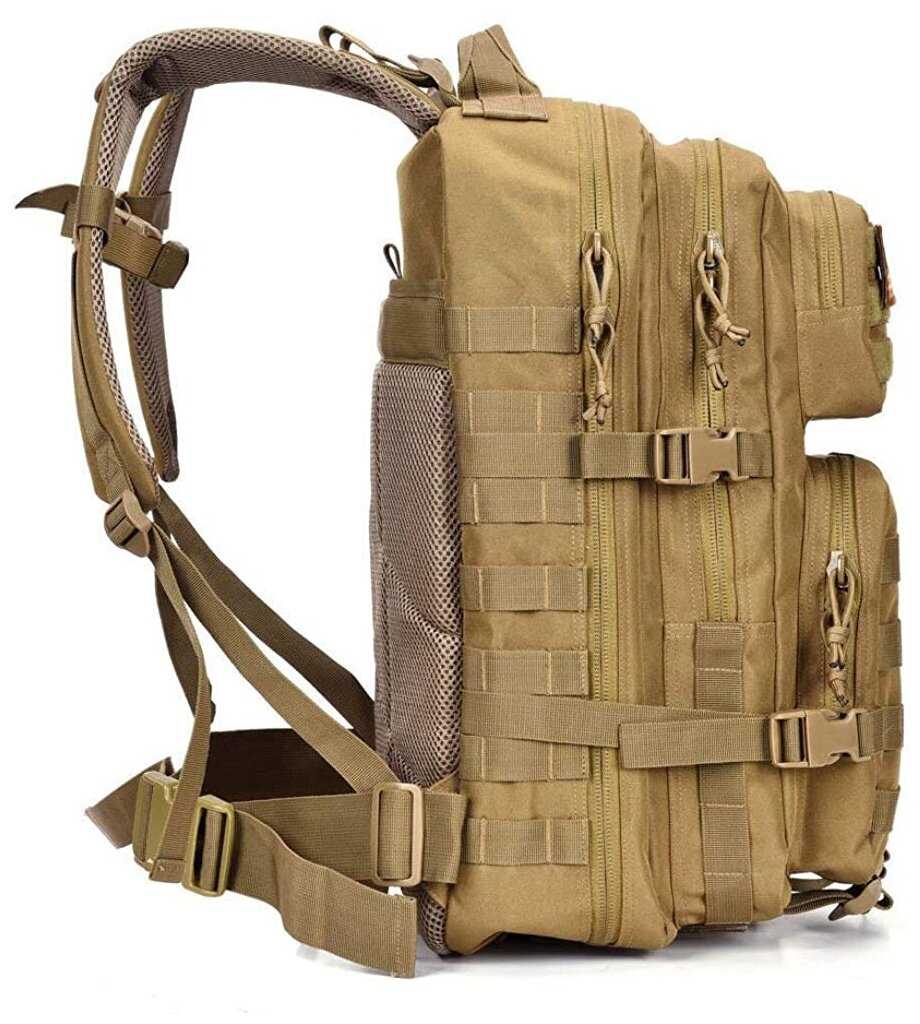 В двойные ремни спереди отлично закрепился штатив. Ремни под дном для пенки/спальника. Большие боковые карманы, свободно входит бутылка 0,6 литров. Нет излишка ремней и креплений, минималистичный для тактического рюкзака, с ним удобно в городе.