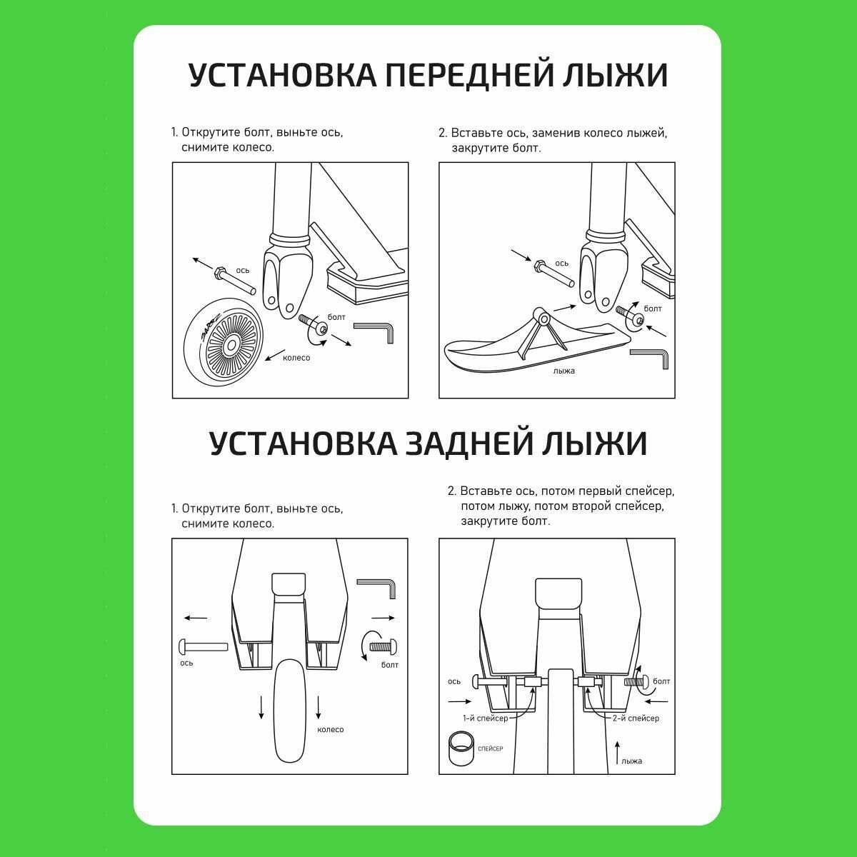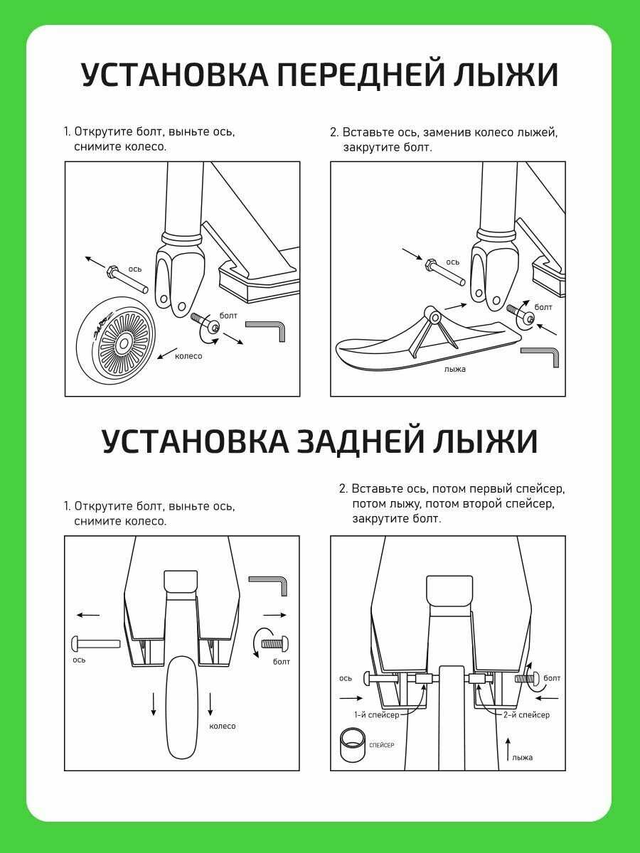 - - невозможно открутить колеса, чтобы поменять на лыжи. отверстия стерлись, пока пытались открутить. ооочень сильно закручены. с одной стороны это хорошо, если был бы просто самокат. Но мы брали для катания зимой. а в итоге, не можем использовать по назначению (