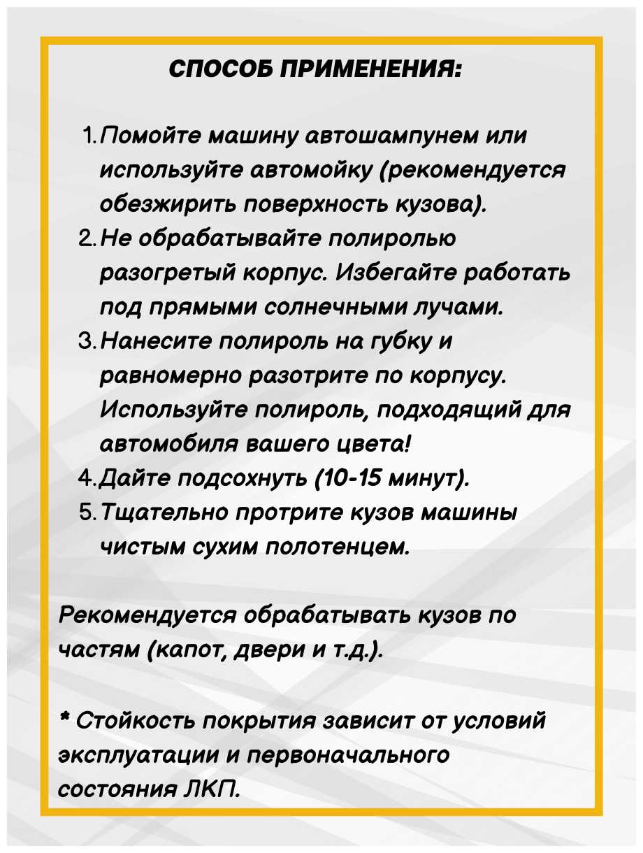 Действие : | защищает ЛКП, маскирует царапины, придает блеск, устраняет голограммы |