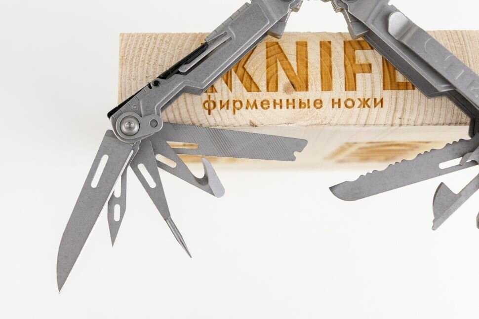 | Инструменты (функции) : | консервный нож, кусачки, линейка, напильник, нож, ножницы, острогубцы, отвертка, открывалка для бутылок, пассатижи, пила, пилка для ногтей, плоскогубцы, шило / кернер, штопор, щипцы |