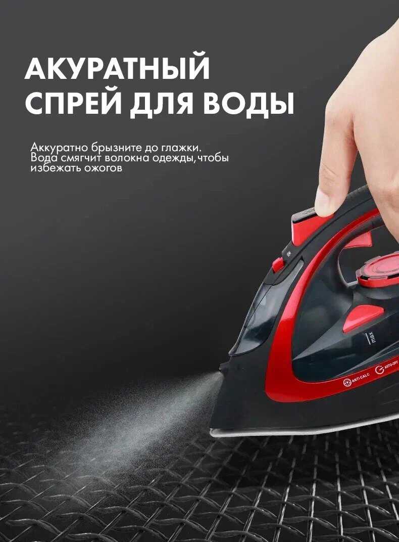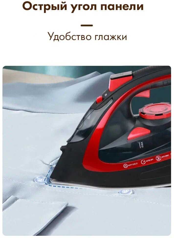 - Эргономичная рукоятка обеспечивает надежный хват, снижая риск скольжения во время интенсивной глажки.