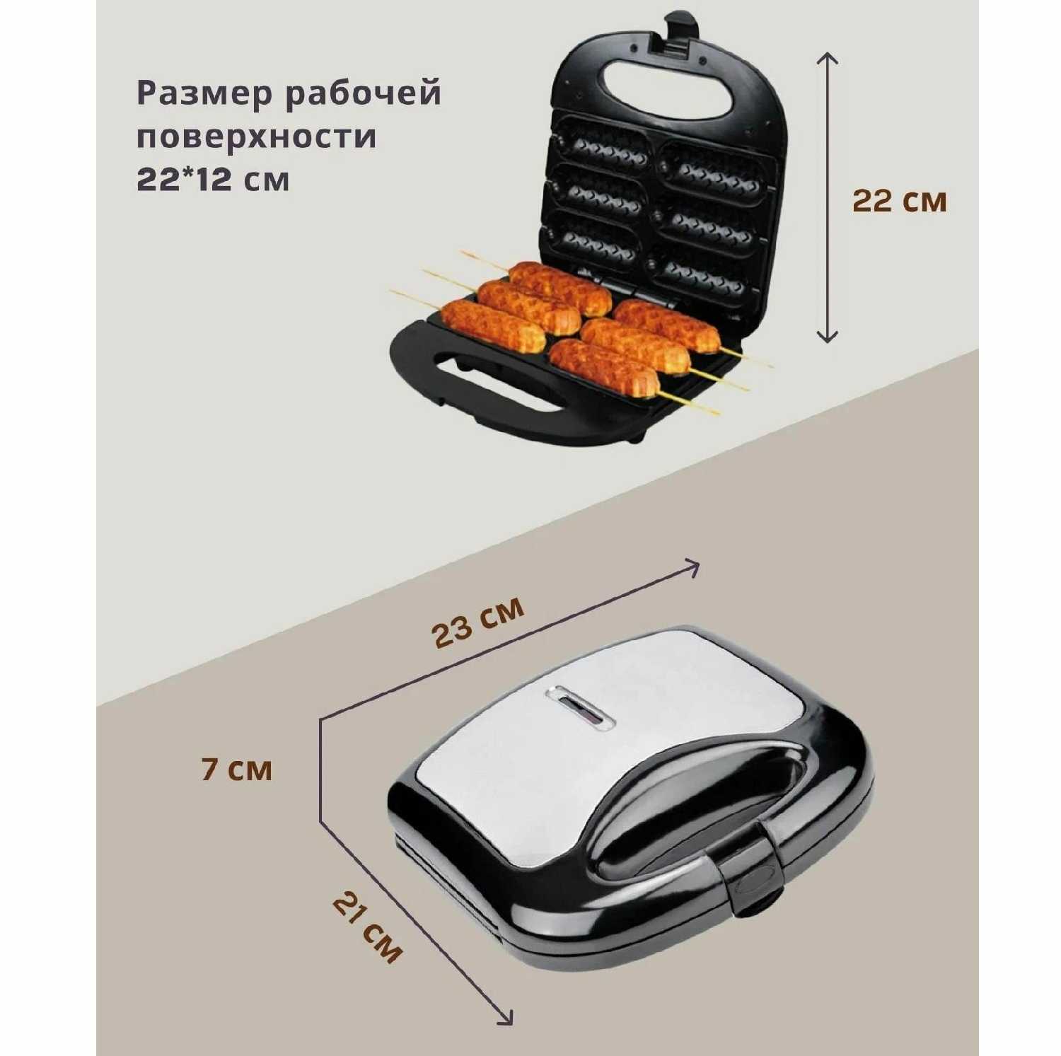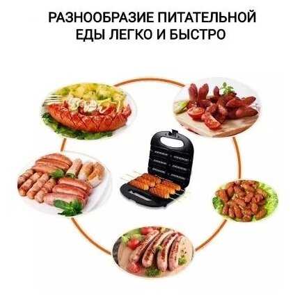 Идеально подходит для сосисок, прожариваются полностью. Очень мощный, поэтому за минут 5 полностью всё можно сделать. Покрытие и правда антипригарное, за все время использования не было каких либо сильных загрязнений. Удобно на даче, да и просто дома, когда чего-то такого хочется