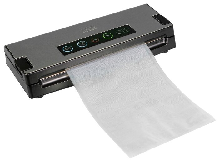 Что касается именно данного аппарата. Есть импульсный режим - можно самим управлять сколько откачать воздуха, съемный лоток. Это есть далеко не у всех. Запаивает хорошо, хоть шов и одинарный. Воздух выкачивает тоже хорошо, кто пишет, что плохо - в зависимости от продукции иногда надо немного помочь и пошевелить пакет. Все-таки это не промышленный аппарат. С твёрдыми продуктами никогда проблем не было. Пакет надо класть гладкой стороной вверх.