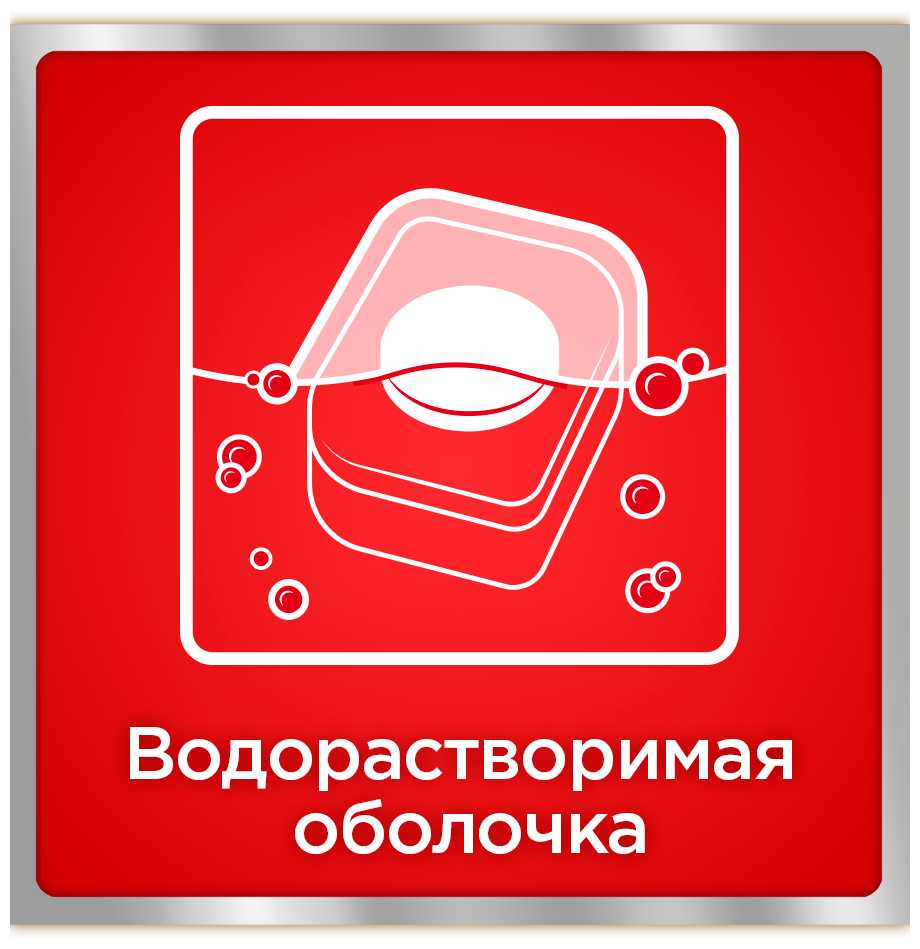 - Водорастворимая оболочка таблетки исключает контакт с кожей и полностью исчезает за цикл мойки.
