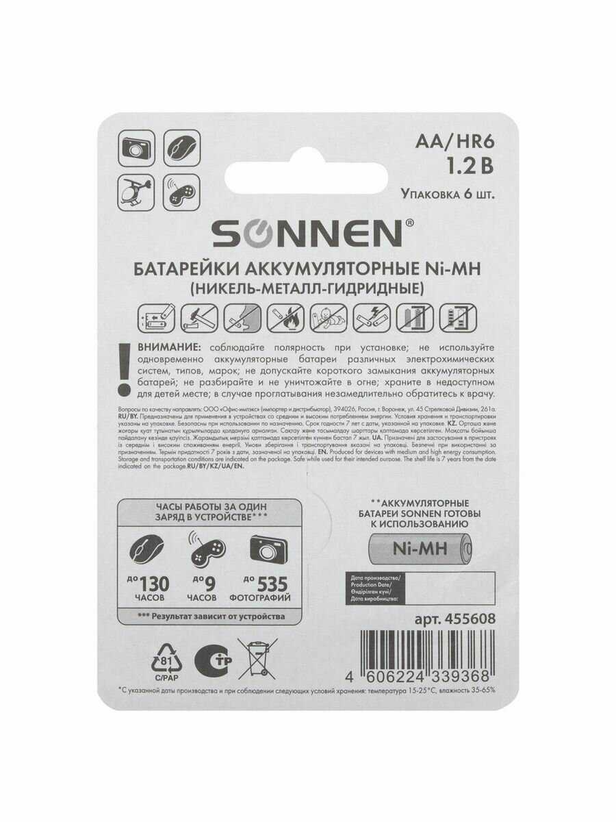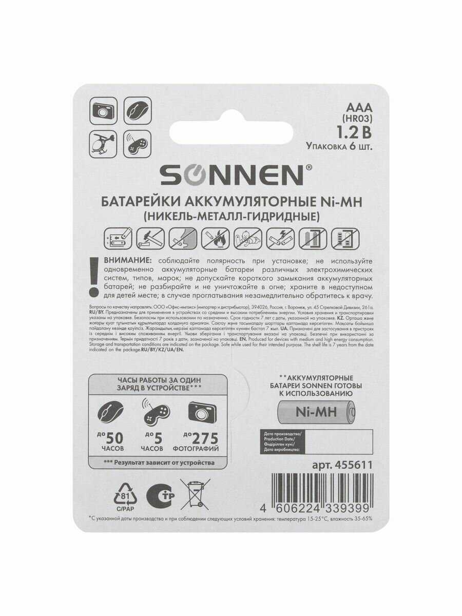 Характеристи SONNEN Батарейки аккумуляторные Ni-Mh мизинчиковые (комплект 6 шт)