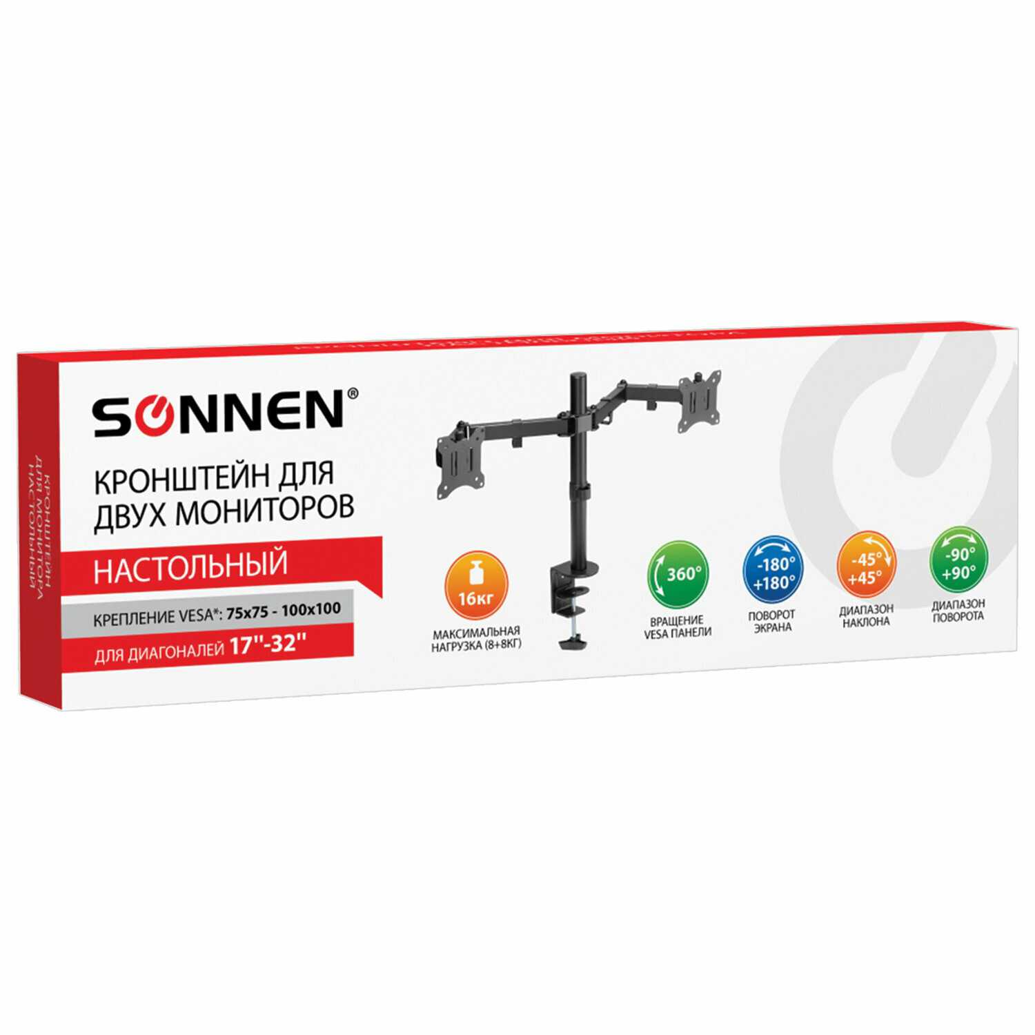 | Комплектация : | Кронштейн для двух мониторов настольный VESA 75х75, 100х100, 17"-32", до 16 кг, SONNEN STATIC, 455943 |