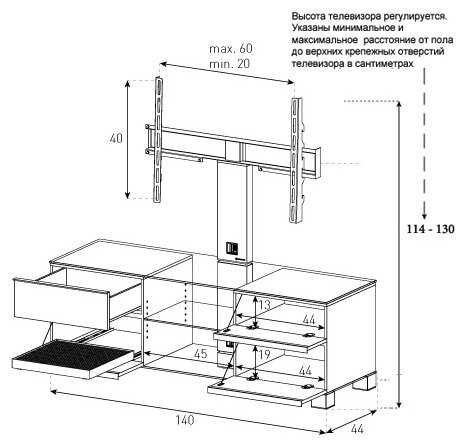 - - Колеса - кошмар, постоянно вылетают: чтобы из вставить обратно - нужно перевернуть стойку (просто приподнять тумбу и вставить колесо невозможно). Стойка имеет ограниченную длину (не хватило буквально 10 см, чтобы 65 дюймов комфортно смотреть с кровати). Выдвижные полки, дверцы открываются с небольшим усилием - хотелось бы плавного открытия