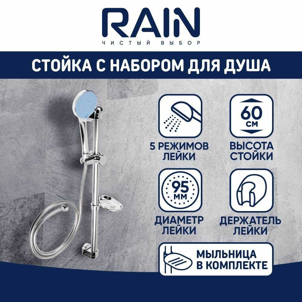 Комплектация : | душевая штанга, лейка, мыльница, шланг |