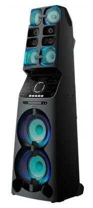 - + - качественный и мощный звук 2 кВт в формате бумбокс «всё-в-одном», состоящий из 10-ти колонок: два 500 Вт сабвуфера, четыре трехполосных среднечастотных динамика по 130 Вт и четыре ВЧ-колонки