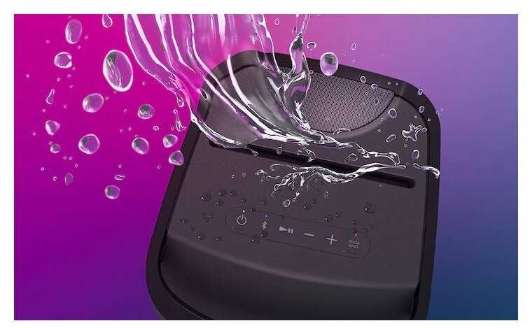 До 25 часов работы от аккумулятора (с быстрой зарядкой). Bluetooth 5.2 (с поддержкой LDAC), AUX, USB Type-A, вход для микрофона и гитары, оптический вход (Toslink). Несмотря на вес в 18.5 кг,есть ручка для переноски, ударопрочный и влагозащищённый корпус(IP67) Встроенное караоке с эффектом эхо, возможность объединения в стереопару (TWS), многопользовательское подключение.