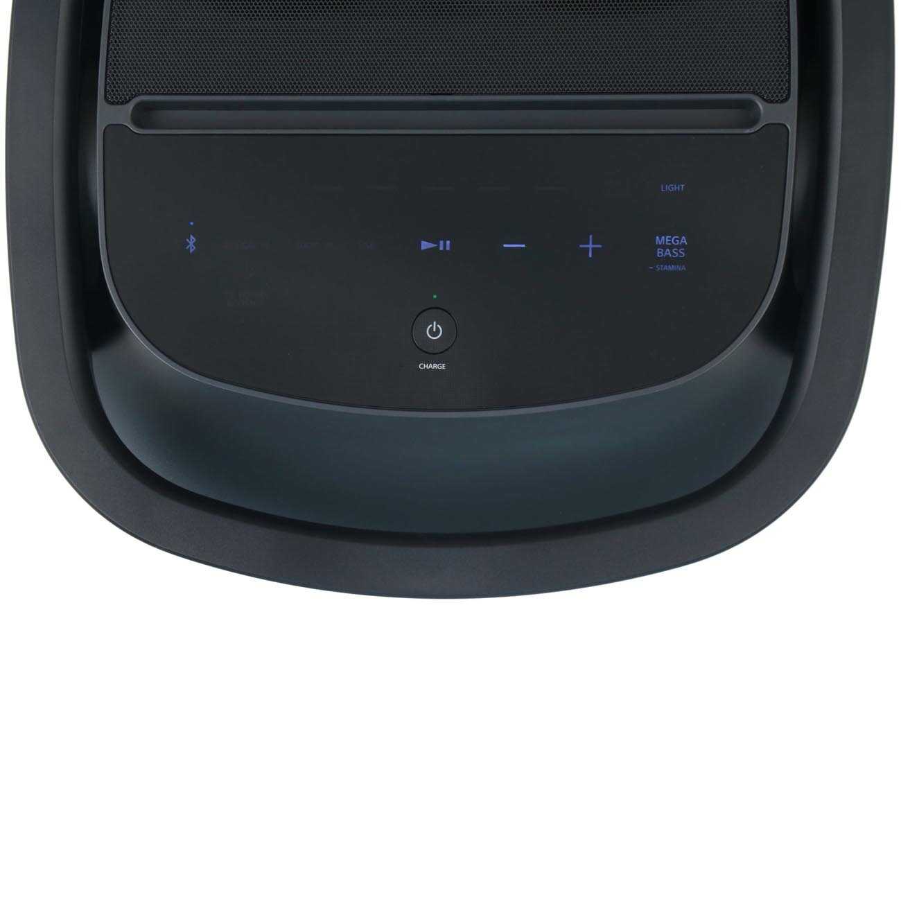 Подсветка сверху и снизу потрясающая, с эффектом прожекторов и стробов направленных по бокам - добивает приличное расстояние до стен, что создает классную атмосферу. А вот лицевая панель вся темная и грустная, в отличие от jbl 710. Серьезная недоработка сони. Встроенный акб держит дольше, чем предполагаешь от колонки такого размера. Управление через приложение на телефоне средненькое, интерфейс с прошлого века, на наборе функций тоже отдохнули. За приложение твердая 3 - сравните с jbl и все поймете.