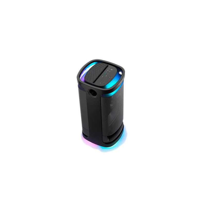 - - Огромная. Тяжелая. Нет телескопической ручки чтобы возить за нее, только верхний фланец. Нет линейных выходов RCA на вторую колонку. Нет линейного входа RCA, только mini jack 3.5mm. Нет подсветки на лицевой панели. На мой взгляд если бы динамики 360 были менее подрезаны снизу, это дало бы более объемный эффект. Нет в комплекте микрофона для караоке.
