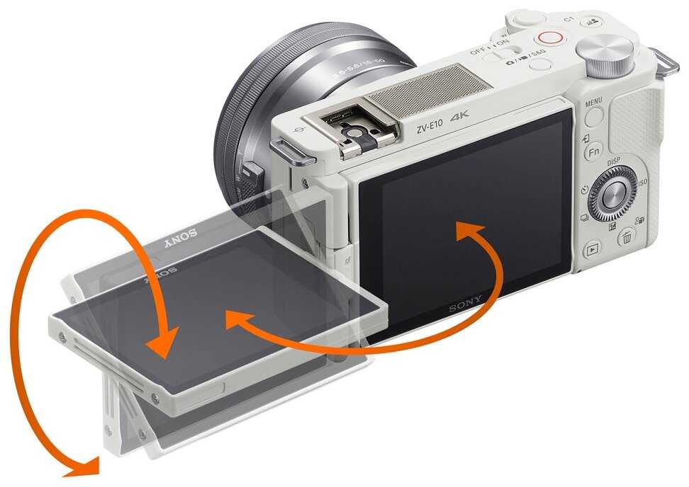 - Экран на 180° поворачивается для фронтального просмотра, упрощая композицию кадров в влогах или стримах без внешних мониторов.
