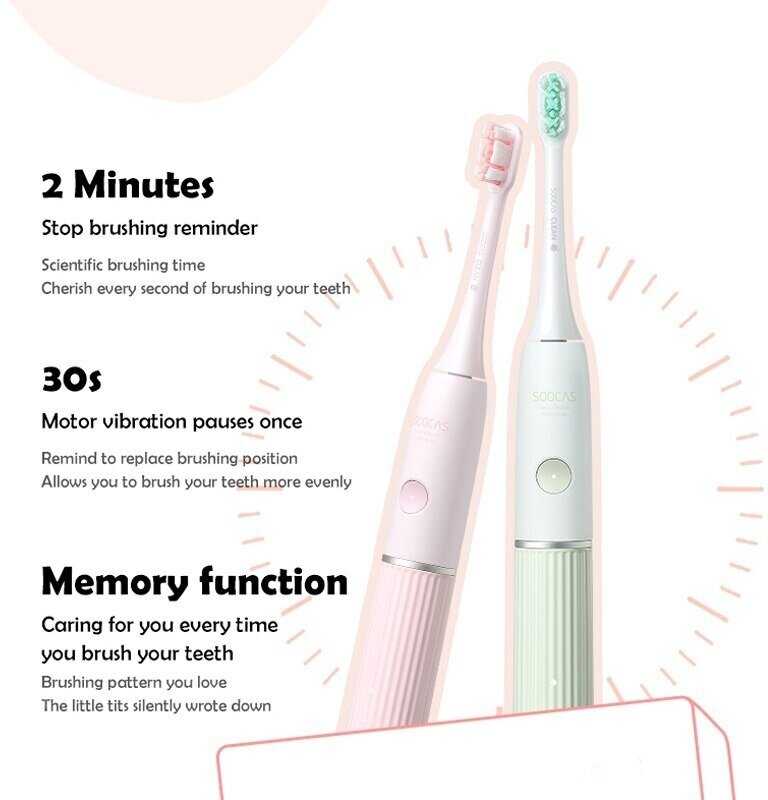 мягкая щетина DuPont, количество вибраций щетинок в минуту: 33600, напоминание о смене положения каждые 30 секунд, автоматическое отключение через 2 минуты, уровень шума: 65 дБ, влагозащита: IPX7, время автономной работы: до 180 дней (при частоте использования 2 раза в день)