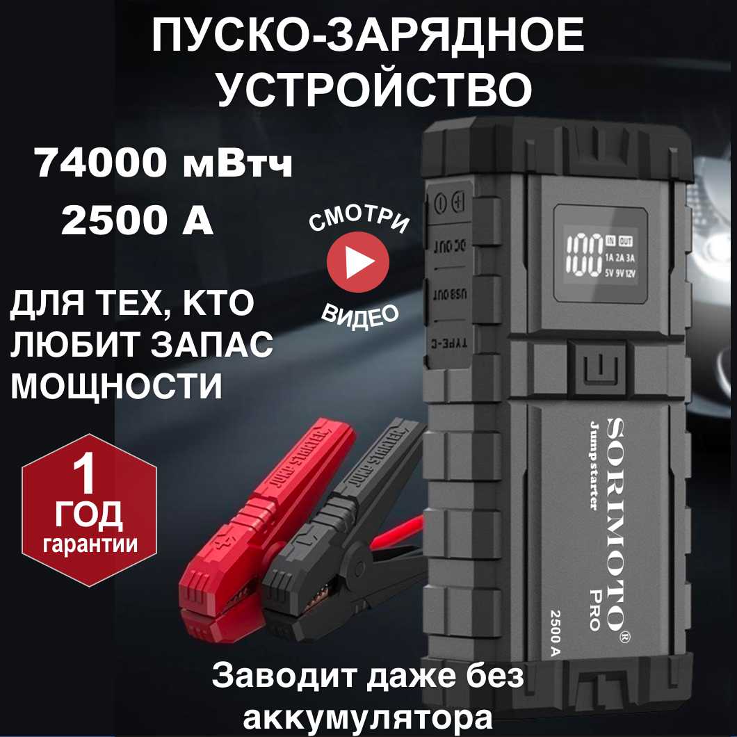 Sorimito X5 — это компактный литий-полимерный бустер, предназначенный для аварийного запуска двигателей легковых автомобилей и микроавтобусов с севшим штатным аккумулятором. Первое впечатление от устройства у большинства покупателей исключительно положительное: его хвалят за солидный внешний вид, качественный пластик без запаха и отличную комплектацию. Устройство поставляется в удобном жестком кейсе-органайзере, где кабели, переходники и крокодилы аккуратно разложены по своим местам. В комплекте, помимо пусковых проводов, идут два кабеля для зарядки (Type-C — Type-C и USB — Type-C), а также четыре насадки для компрессора на разные ниппели. Внимание к мелочам, вроде прорезиненной части на шланге для удобного вкручивания, также отмечается как приятный бонус. Инструкция полностью на русском языке и написана понятно. С первого взгляда устройство вызывает доверие и выглядит как добротно собранный гаджет, а не дешевая самоделка.Эффективность запуска двигателя