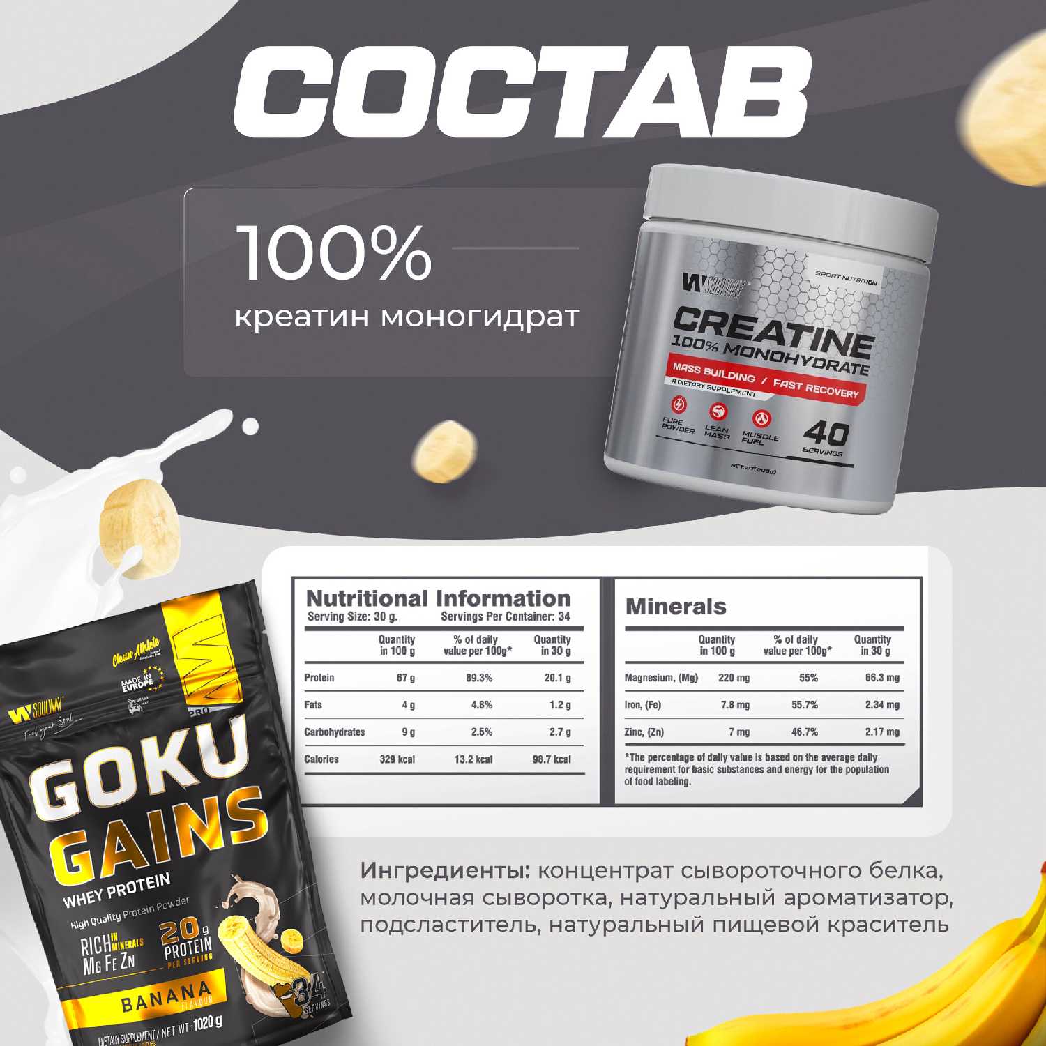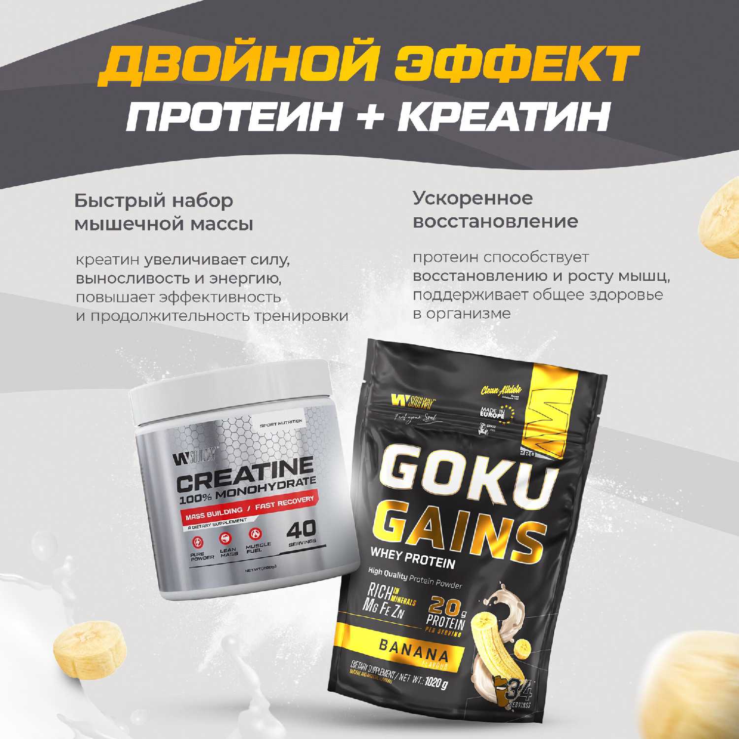 - В комбинации с креатином набор помогает удерживать форму во время отдыха, предотвращая потерю силы и объема.