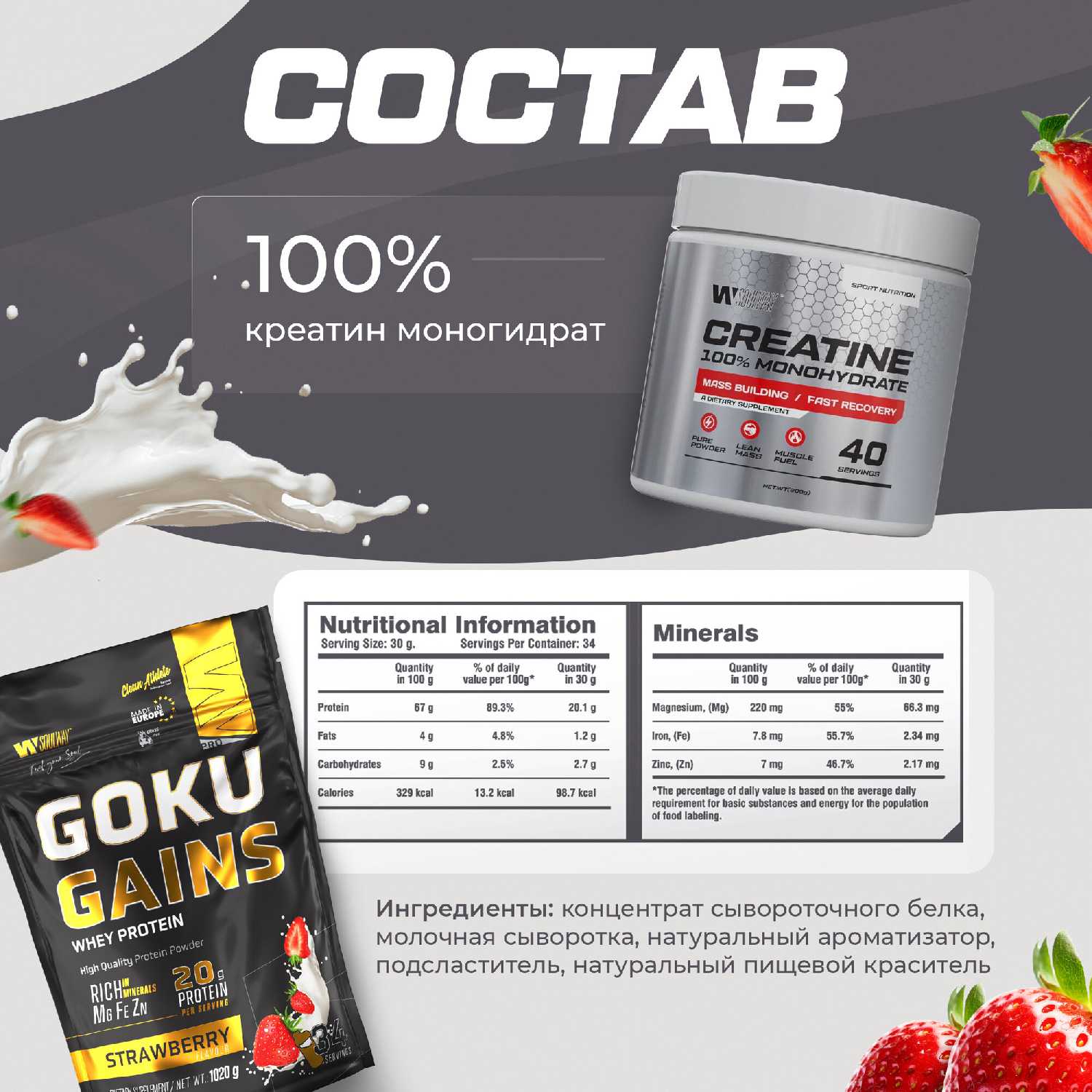 - Отсутствие посторонних привкусов в креатине и цинке усиливает общую привлекательность набора, способствуя лучшему соблюдению режима питания.