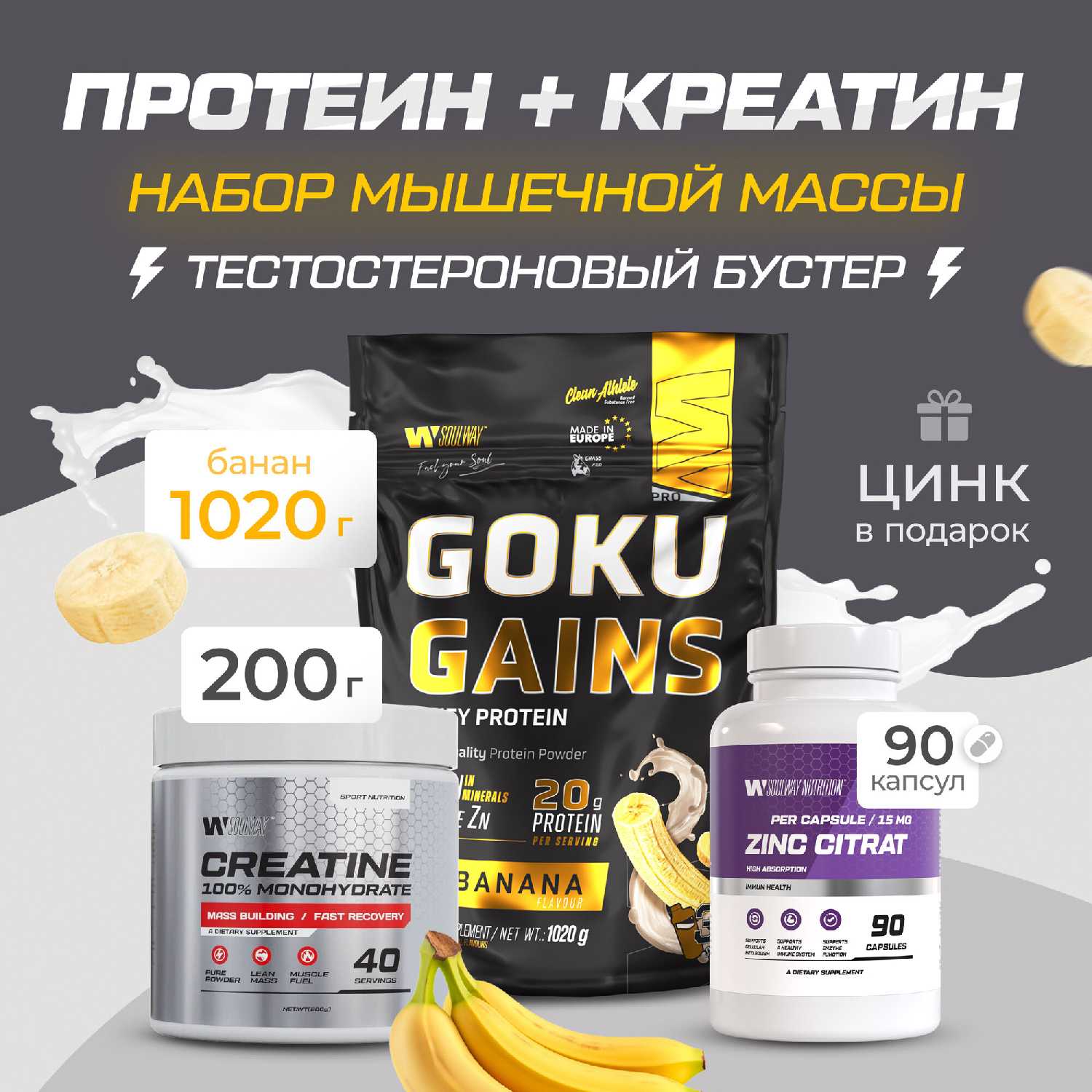 - Качественный состав цинка усиливает синергию с протеином и креатином, повышая общую эффективность набора для физического развития.