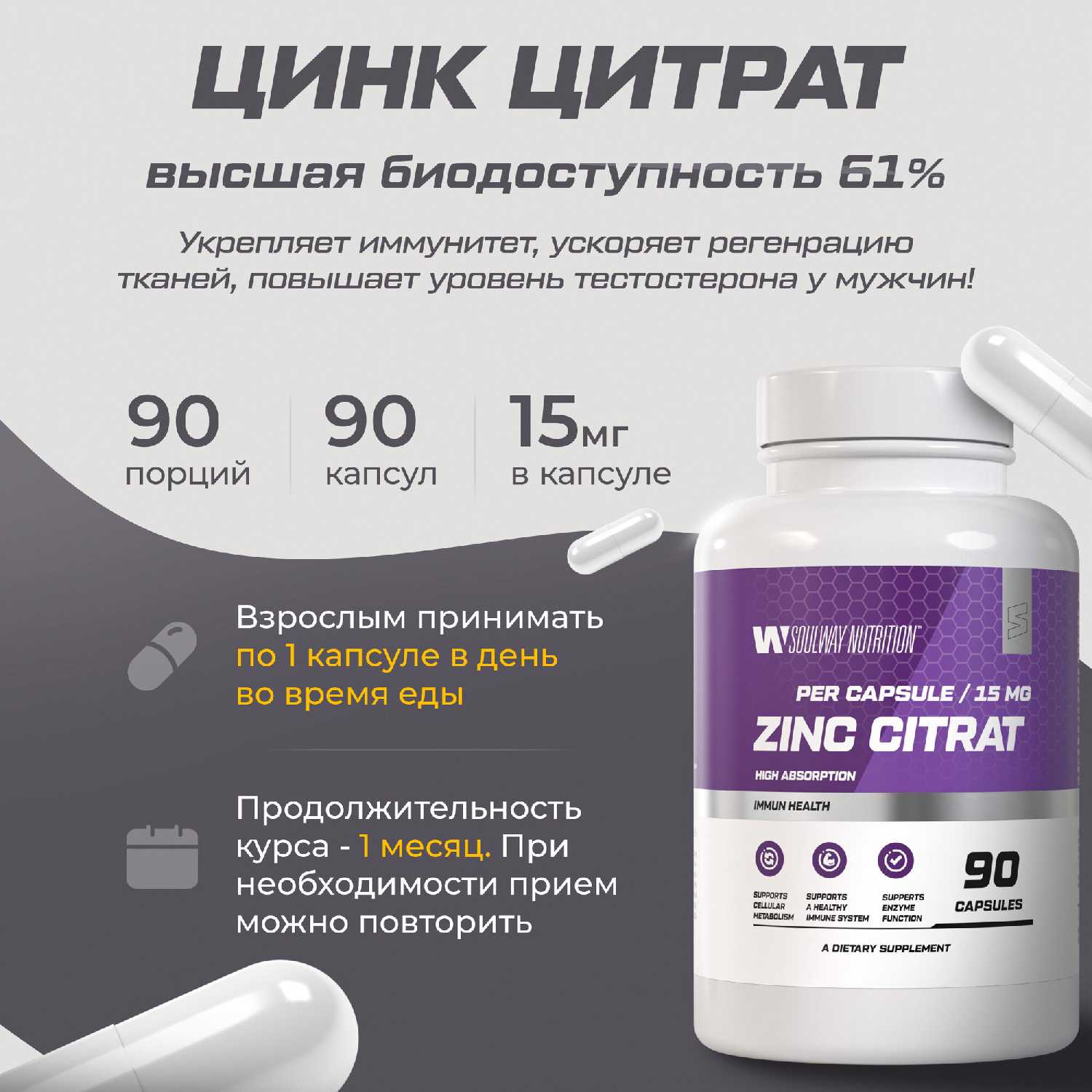 - Цитрат цинка в капсулах или порошке способствует повышению сопротивляемости инфекциям, особенно во время интенсивных нагрузок.