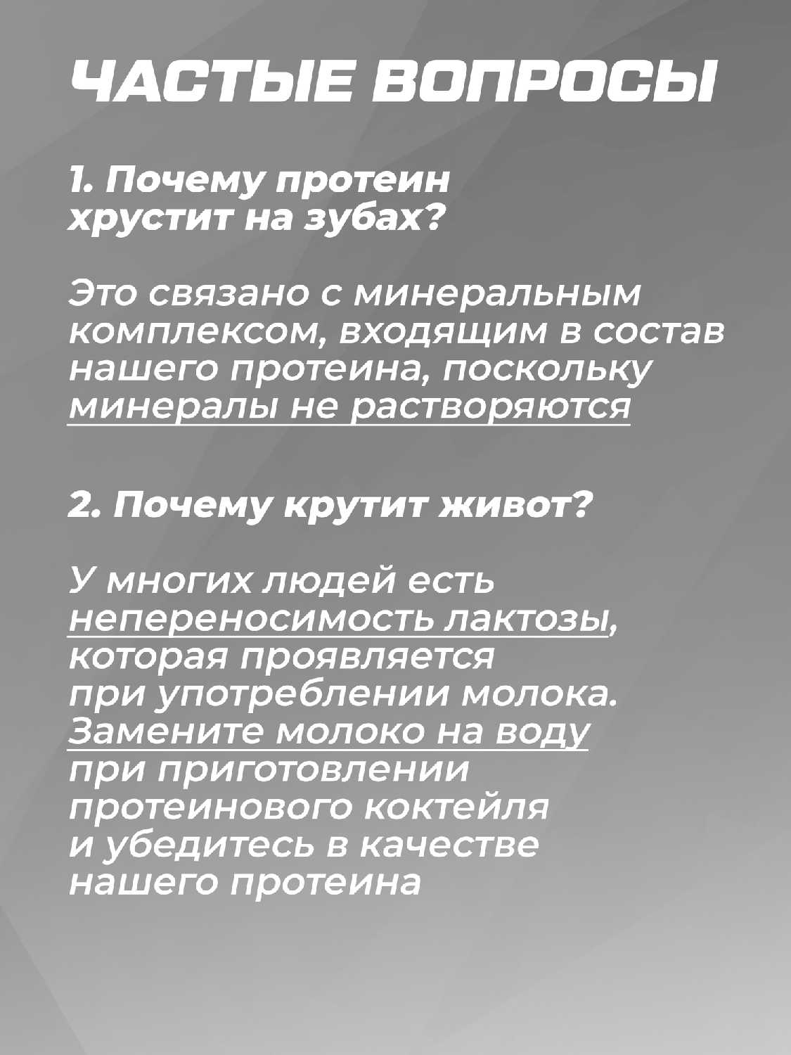 - Протеин не вызывает вздутия или диареи даже у пользователей с нормальной переносимостью лактозы, обеспечивая комфортный переход к новому питанию.