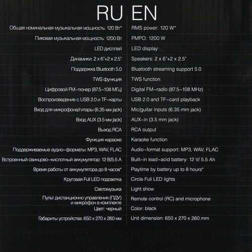 Брал для работы в гараже, по назначению не попала заменила мою электронику в доме. Раньше включал для гимнастики блю-рэй проигрыватель, усилитель Над, колонки Карвет по 300 вт. и ТВ для экранного меню, кошмар в виде 8-10 минут, теперь это происходит за 3 секунды и флешка играет. Батареей не пользовался нет надобности подключена всегда в розетку через автомат. Я доволен этой колонкой всё в одной.