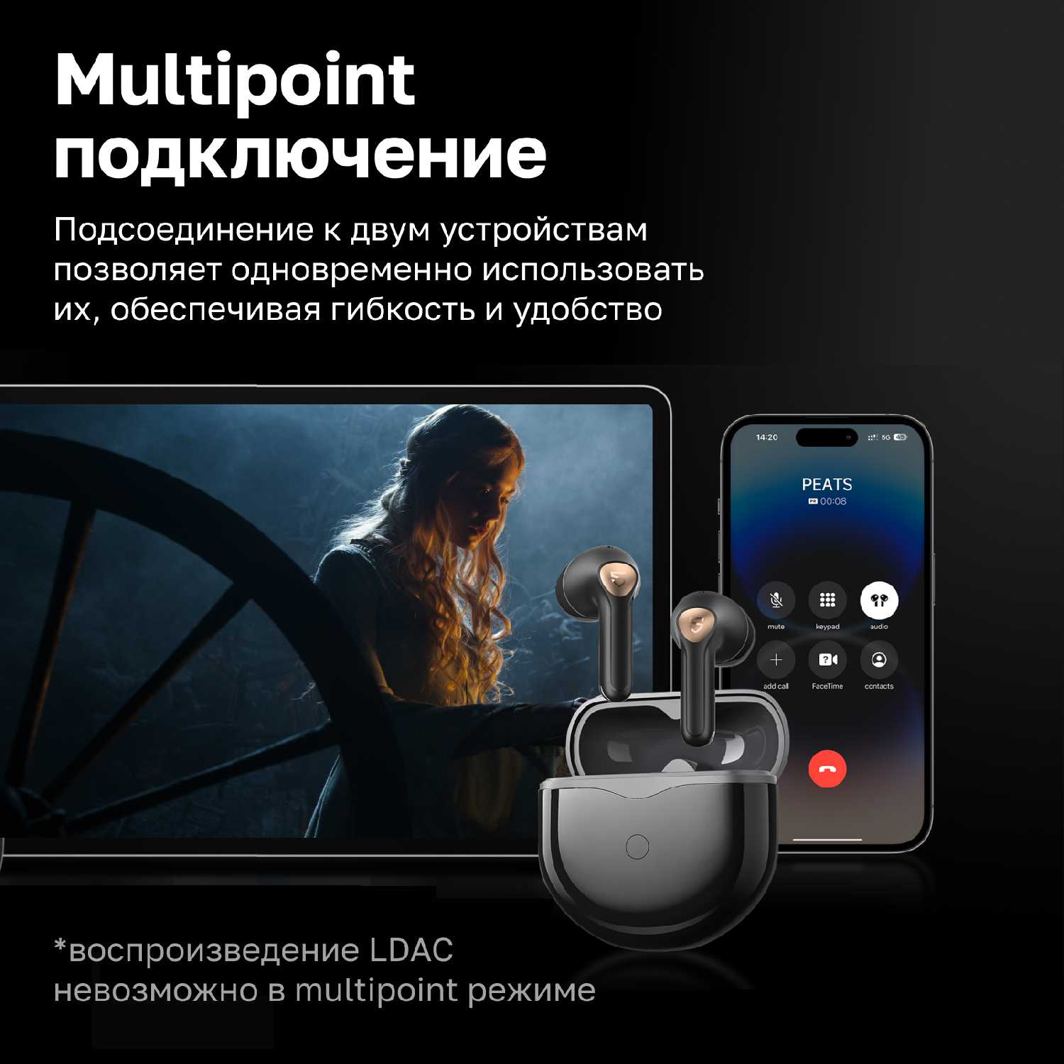 - Поддержка кодека LDAC обеспечивает чистый, мягкий и ровный звук, превосходящий бюджетные модели вроде Haylou GT7 или Soundpeats T3.