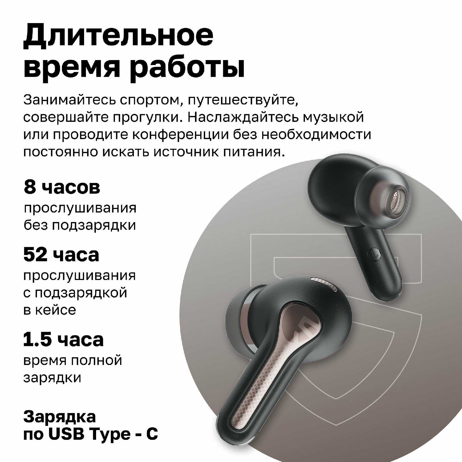 - Заряд кейса требуется раз в месяц при частом использовании полгода, а сами наушники держат 4-6 часов с ANC и LDAC.