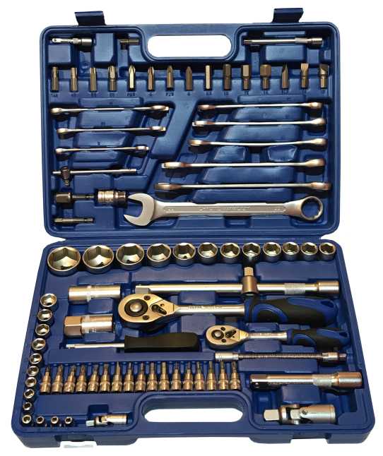 | Инструменты в комплекте : | вороток для головок, длинногубцы, клещи, ключ разводной, ключи гаечные, ключи имбусовые (шестигранные), отвёртки, пассатижи, плоскогубцы, рукоять для бит, рукоять для головок, трещотка |