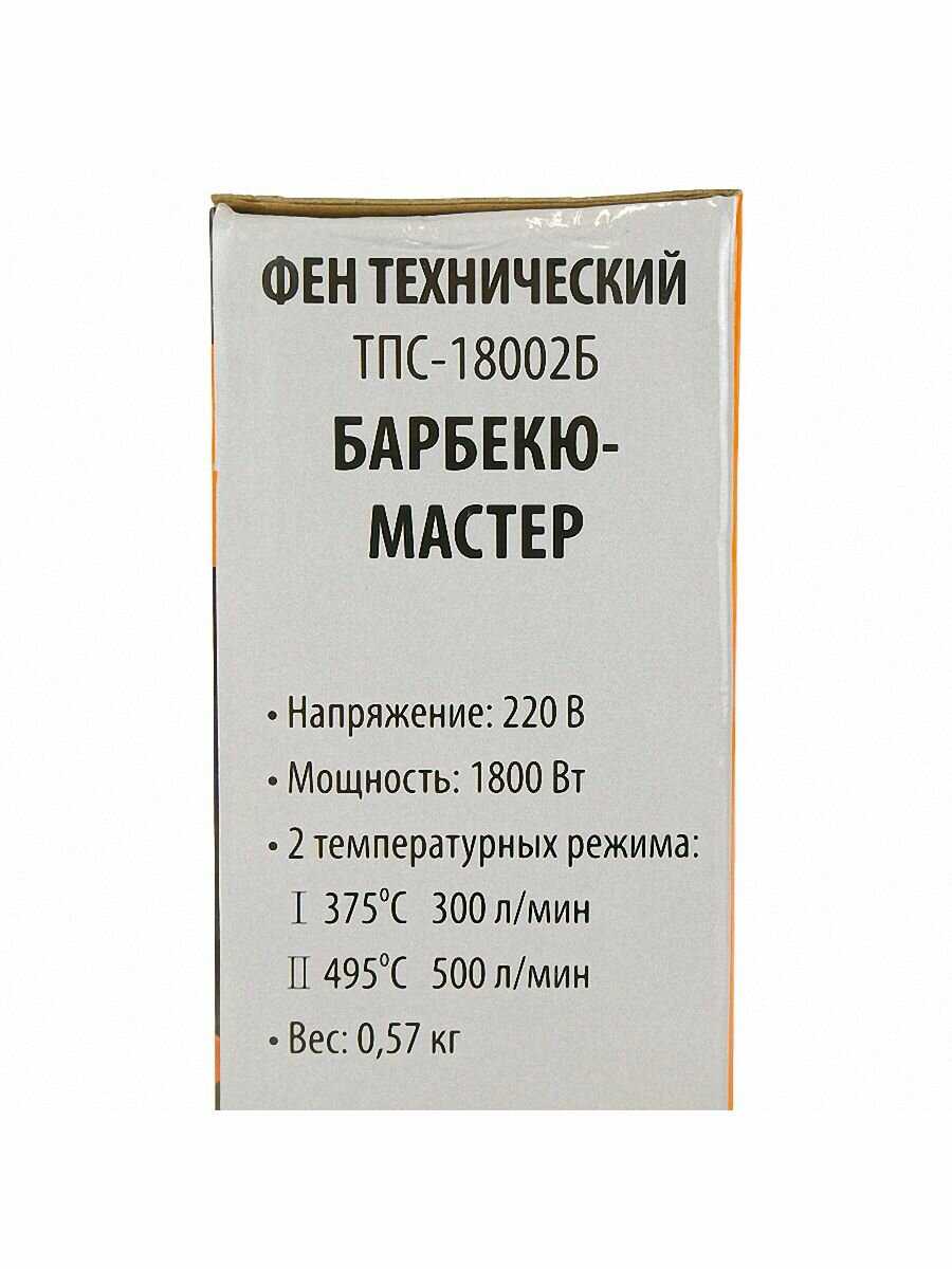 | Дополнительная информация : | 2 режима работы - 375 °C 300 л/мин, 495 °C 500 л/мин, насадка для раздувания мангалов в комплекте, длина кабеля: 1.8 м |