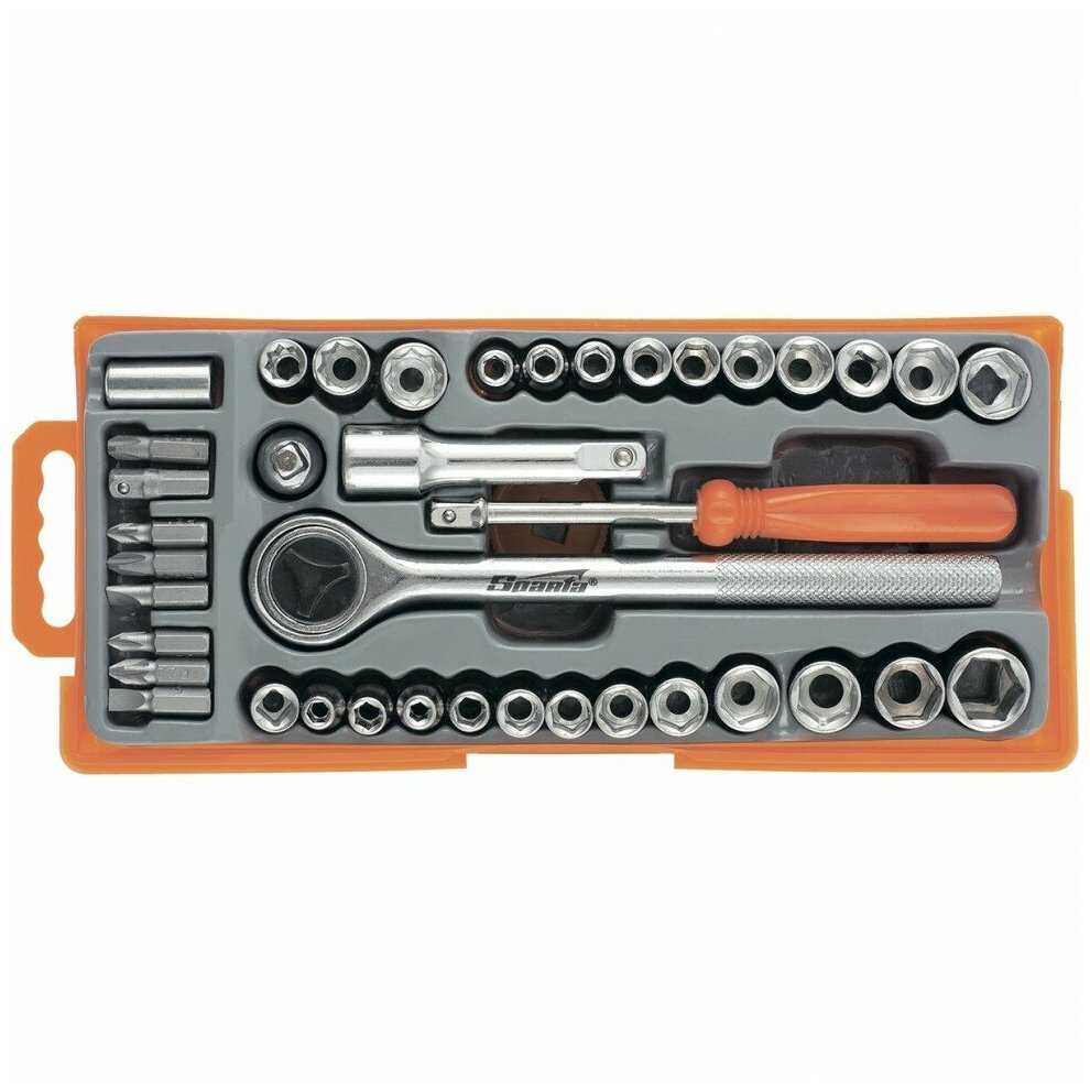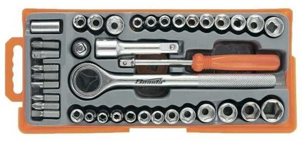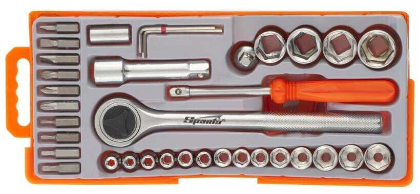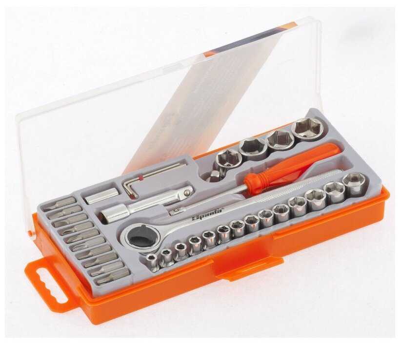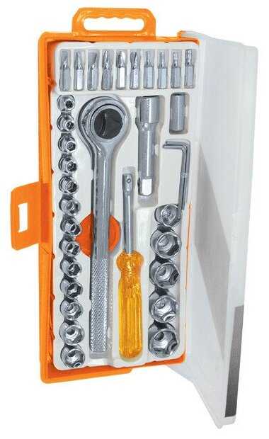 Инструменты в комплекте : | вороток для головок, ключ разводной, ключи гаечные, ключи имбусовые (шестигранные), ключи торцевые, отвёртки, пассатижи, плоскогубцы, рукоять для бит, трещотка |
