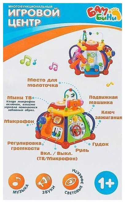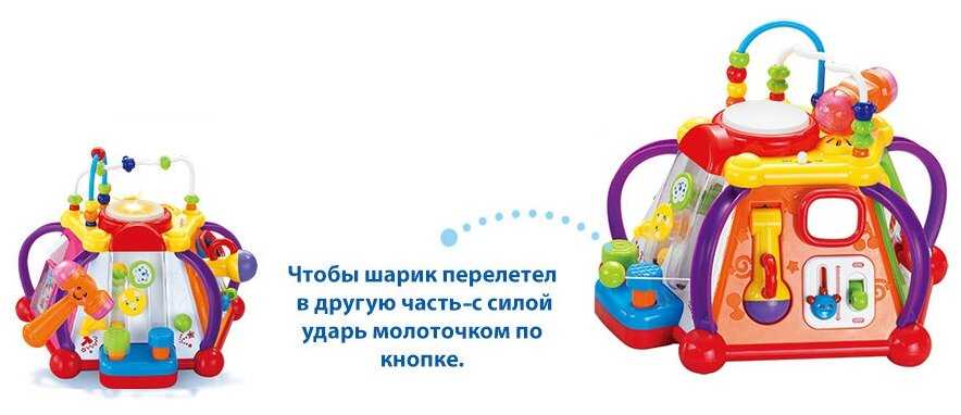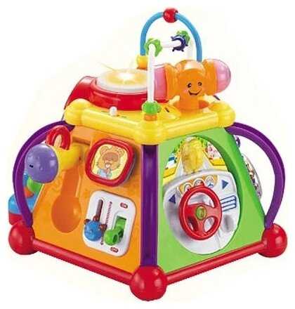 - Игрушка оснащена множеством кнопок, рычагов, вращающихся элементов и звуковых эффектов, что стимулирует мелкую моторику и логику.