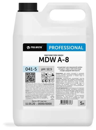 7.1/10 балловPro-Brite MACHINE DISH WASH MDW A-8 концентрат для машинной мойки посуды и тары в жёсткой воде и в воде средней жёсткости