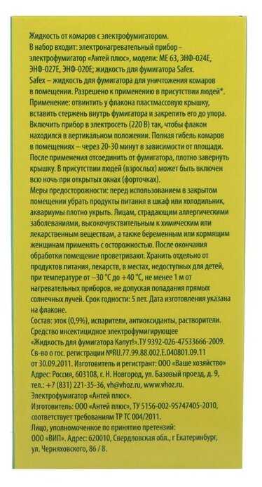 Характеристики:- время действия жидкости для фумигатора: 30 ночей