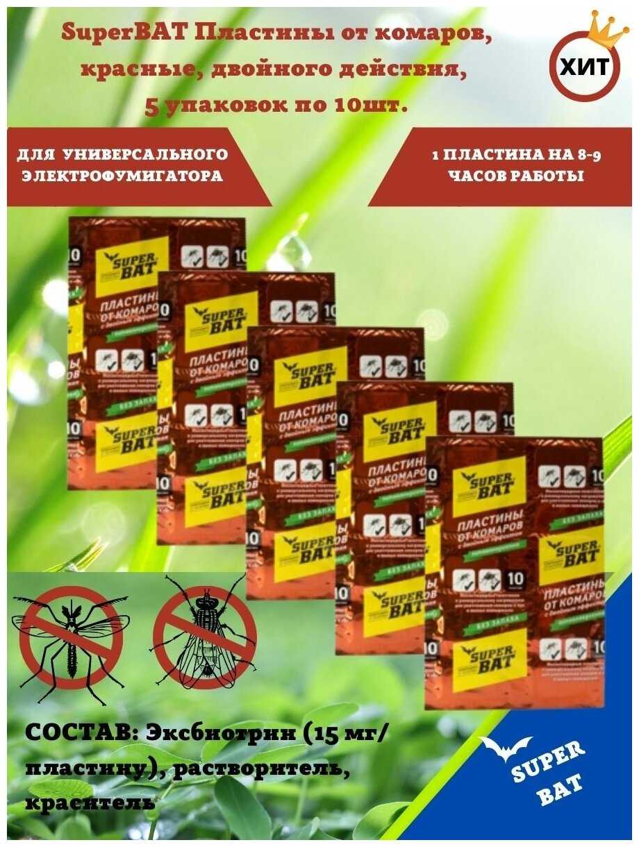 SUPER BAT Набор SuperBAT Пластины от комаров зеленые 5х10 шт. средство инсектицидное без запаха, универсальный электрофумигатор SuperBAT.